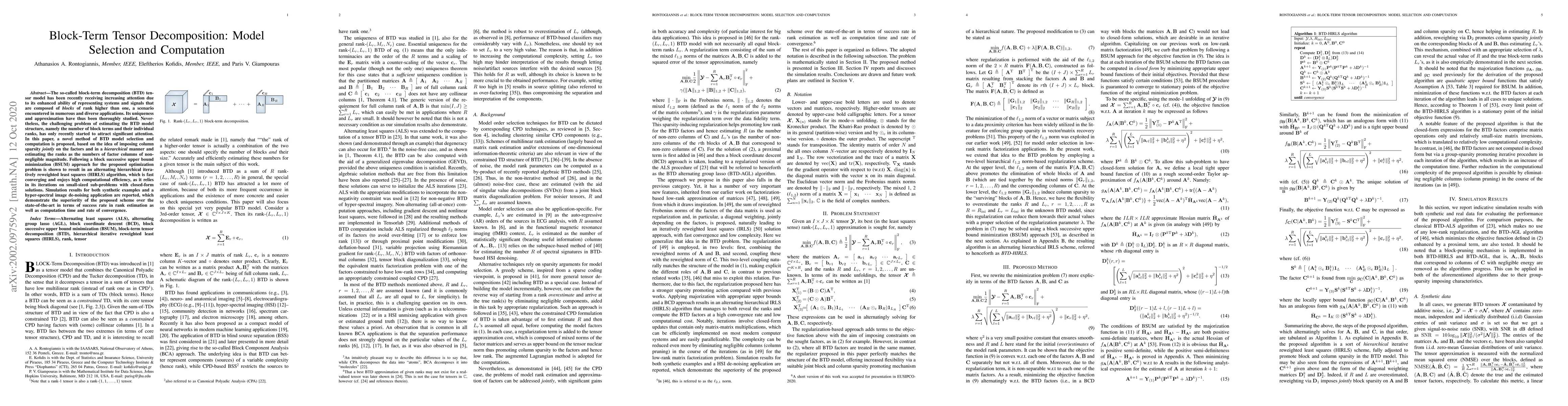 A new method for selecting and computing block-term tensor decomposition models is proposed, achieving faster convergence and higher efficiency than existing schemes through hierarchical iterative reweighted least squares algorithm.