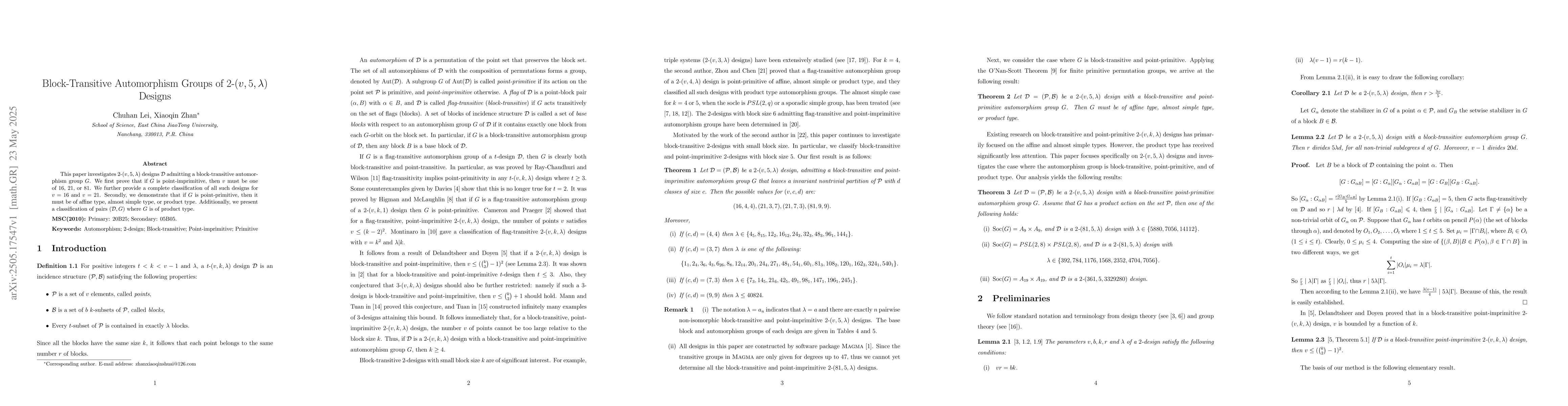 The paper presents detailed classification results and proofs for block-transitive automorphism groups of 2-(v,5,λ) designs, particularly for point-imprimitive and point-primitive cases.