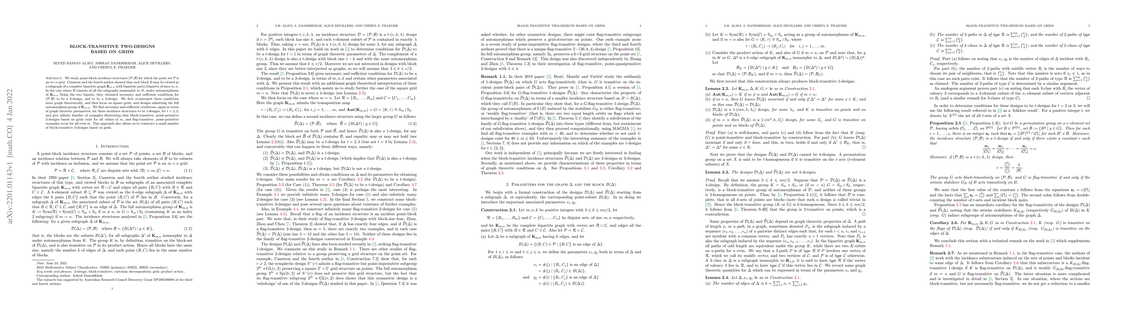 The research investigates block-transitive two-designs based on grids, utilizing graph-theoretic conditions to determine when these structures are t-designs (t=2, 3).