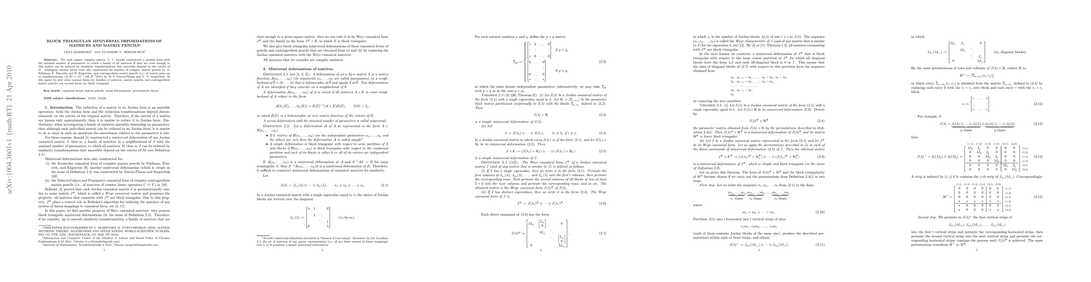 For each square complex matrix, V. I. Arnold constructed a normal form with the minimal number of parameters to which a family of all matrices B that are close enough to this matrix can be reduced by similarity transformations that smoothly depend on the entries of B. Analogous normal forms were also constructed for families of complex matrix pencils by A. Edelman, E. Elmroth, and B. Kagstrom, and contragredient matrix pencils (i.e., of matrix pairs up to transformations (A,B)-->(S^{-1}AR,R^{-1}BS)) by M. I. Garcia-Planas and V. V. Sergeichuk. In this paper we give other normal forms for families of matrices, matrix pencils, and contragredient matrix pencils; our normal forms are block triangular.