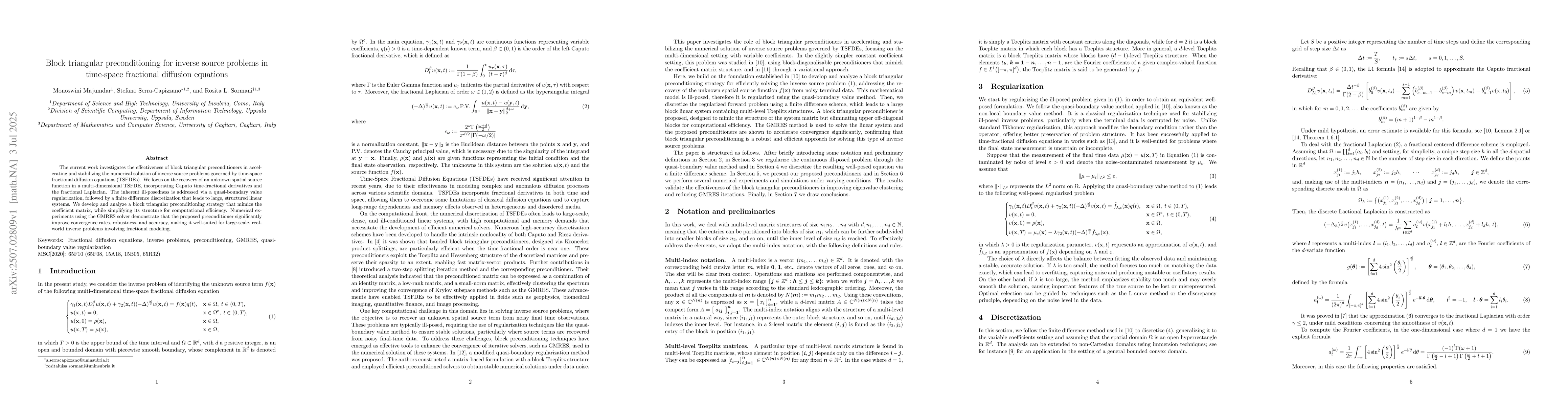 The current work investigates the effectiveness of block triangular preconditioners in accelerating and stabilizing the numerical solution of inverse source problems governed by time-space fractional diffusion equations (TSFDEs). We focus on the recovery of an unknown spatial source function in a multi-dimensional TSFDE, incorporating Caputo time-fractional derivatives and the fractional Laplacian. The inherent ill-posedness is addressed via a quasi-boundary value regularization, followed by a finite difference discretization that leads to large, structured linear systems. We develop and analyze a block triangular preconditioning strategy that mimics the coefficient matrix, while simplifying its structure for computational efficiency. Numerical experiments using the GMRES solver demonstrate that the proposed preconditioner significantly improve convergence rates, robustness, and accuracy, making it well-suited for large-scale, real-world inverse problems involving fractional modeling.