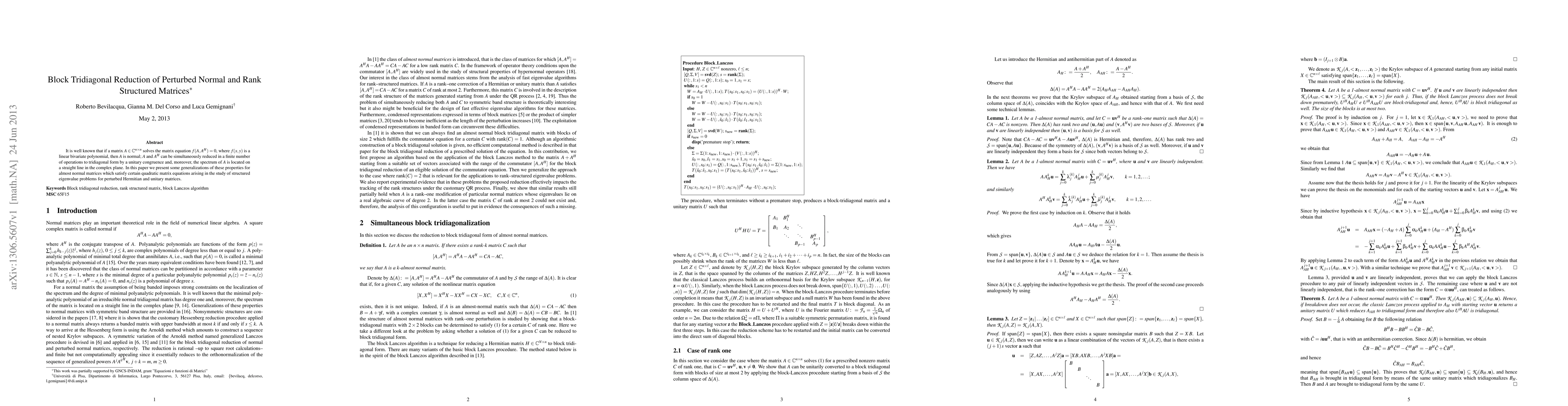 It is well known that if a matrix $A\in\mathbb C^{n\times n}$ solves the matrix equation $f(A,A^H)=0$, where $f(x, y)$ is a linear bivariate polynomial, then $A$ is normal; $A$ and $A^H$ can be simultaneously reduced in a finite number of operations to tridiagonal form by a unitary congruence and, moreover, the spectrum of $A$ is located on a straight line in the complex plane. In this paper we present some generalizations of these properties for almost normal matrices which satisfy certain quadratic matrix equations arising in the study of structured eigenvalue problems for perturbed Hermitian and unitary matrices.