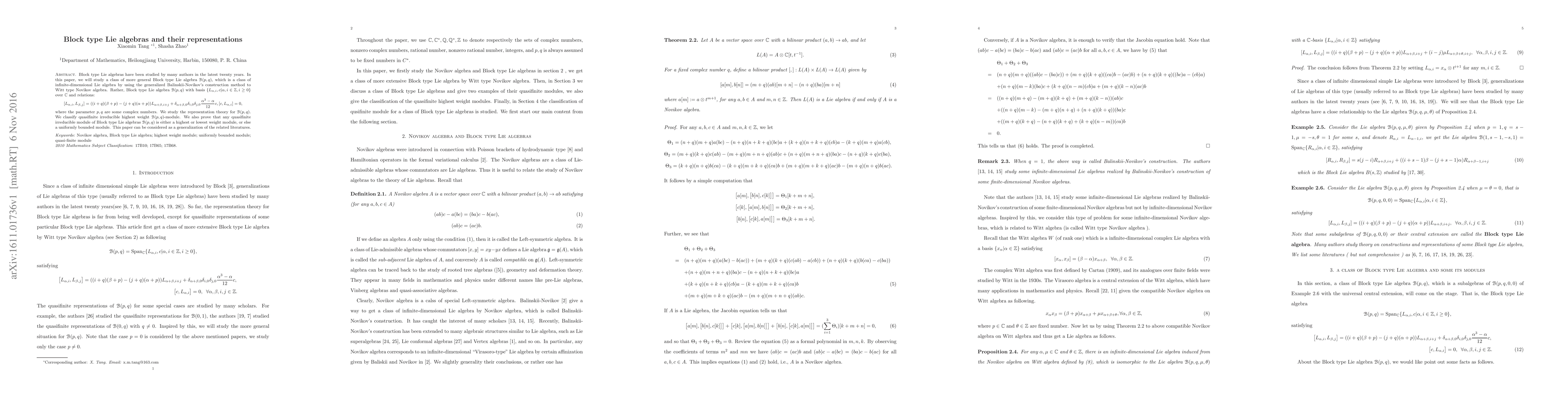 Block type Lie algebras have been studied by many authors in the latest twenty years. In this paper, we will study a class of more general Block type Lie algebra $\mathcal{B}(p,q)$, which is a class of infinite-dimensional Lie algebra by using the generalized Balinskii-Novikov's construction method to Witt type Novikov algebra. We study the representation theory for $\mathcal{B}(p,q)$. We classify quasifinite irreducible highest weight $\mathcal{B}(p,q)$-module. We also prove that any quasifinite irreducible module of Block type Lie algebras $\mathcal{B}(p,q)$ is either a highest or lowest weight module, or else a uniformly bounded module. This paper can be considered as a generalization of the related literatures.