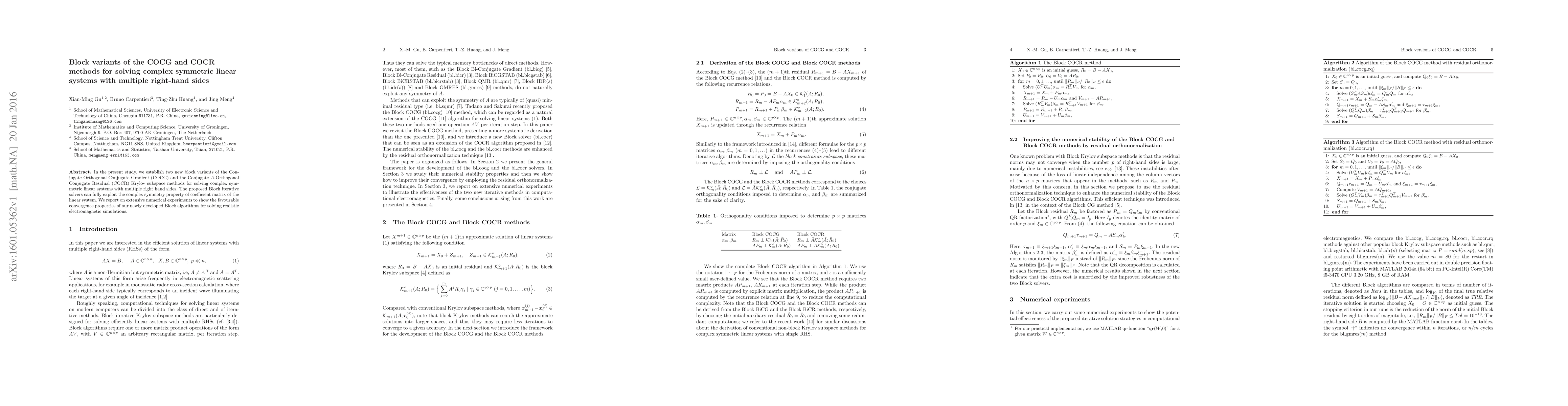 In the present study, we establish two new block variants of the Conjugate Orthogonal Conjugate Gradient (COCG) and the Conjugate A-Orthogonal Conjugate Residual (COCR) Krylov subspace methods for solving complex symmetric linear systems with multiple right hand sides. The proposed Block iterative solvers can fully exploit the complex symmetry property of coefficient matrix of the linear system. We report on extensive numerical experiments to show the favourable convergence properties of our newly developed Block algorithms for solving realistic electromagnetic simulations.