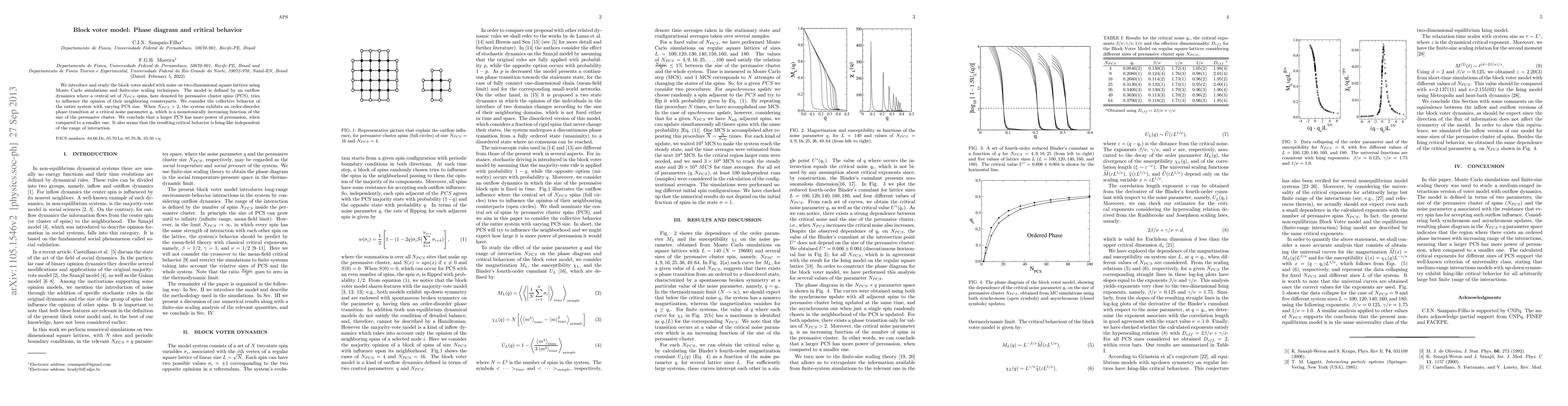 The block voter model with noise on two-dimensional square lattices demonstrates an order-disorder phase transition influenced by the size of a central persuasive cluster. The system shows Ising-like critical behavior, indicating that larger persuasive clusters have greater persuasive power.