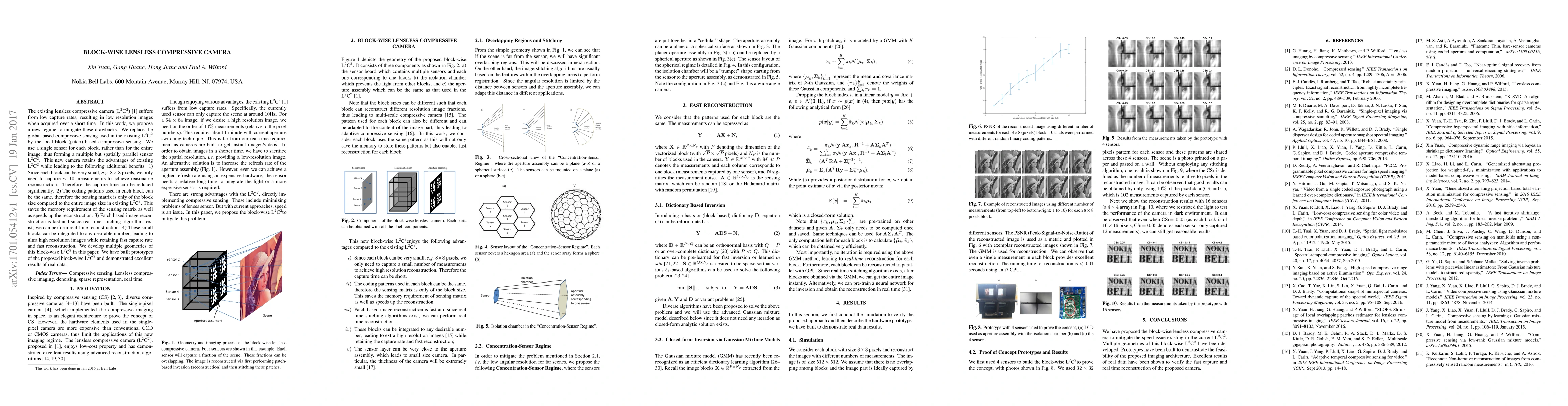 This paper proposes a block-wise lensless compressive camera that uses local block-based compressive sensing to significantly reduce capture time and memory requirements. The method allows for real-time reconstruction and high-resolution imaging by integrating small sensor blocks.