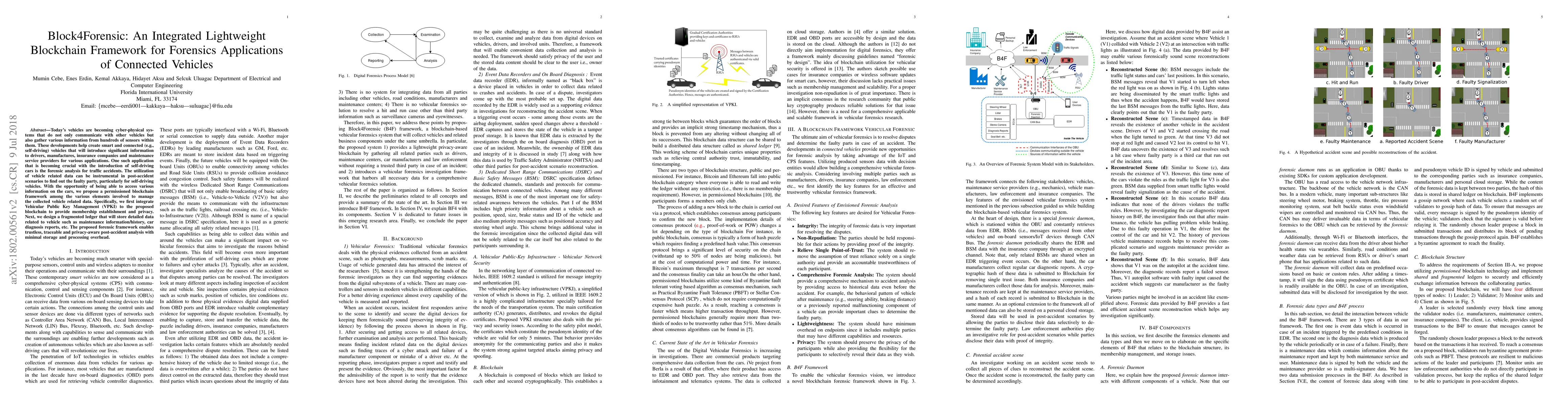 Today's vehicles are becoming cyber-physical systems that do not only communicate with other vehicles but also gather various information from hundreds of sensors within them. These developments help create smart and connected (e.g., self-driving) vehicles that will introduce significant information to drivers, manufacturers, insurance companies and maintenance service providers for various applications. One such application that is becoming crucial with the introduction of self-driving cars is the forensic analysis for traffic accidents. The utilization of vehicle-related data can be instrumental in post-accident scenarios to find out the faulty party, particularly for self-driving vehicles. With the opportunity of being able to access various information on the cars, we propose a permissioned blockchain framework among the various elements involved to manage the collected vehicle-related data. Specifically, we first integrate Vehicular Public Key Management (VPKI) to the proposed blockchain to provide membership establishment and privacy. Next, we design a fragmented ledger that will store detailed data related to vehicle such as maintenance information/history, car diagnosis reports, etc. The proposed forensic framework enables trustless, traceable and privacy-aware post-accident analysis with minimal storage and processing overhead.
