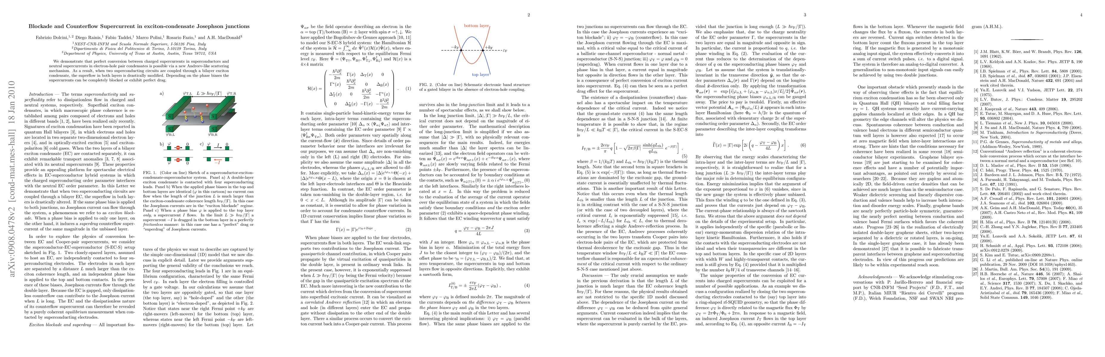 This paper demonstrates a new Andreev-like scattering mechanism that allows perfect conversion between charged supercurrents in superconductors and neutral supercurrents in exciton condensates. The study shows that coupling two superconducting circuits through an exciton condensate bilayer can either block supercurrents completely or cause perfect drag, depending on phase biases.
