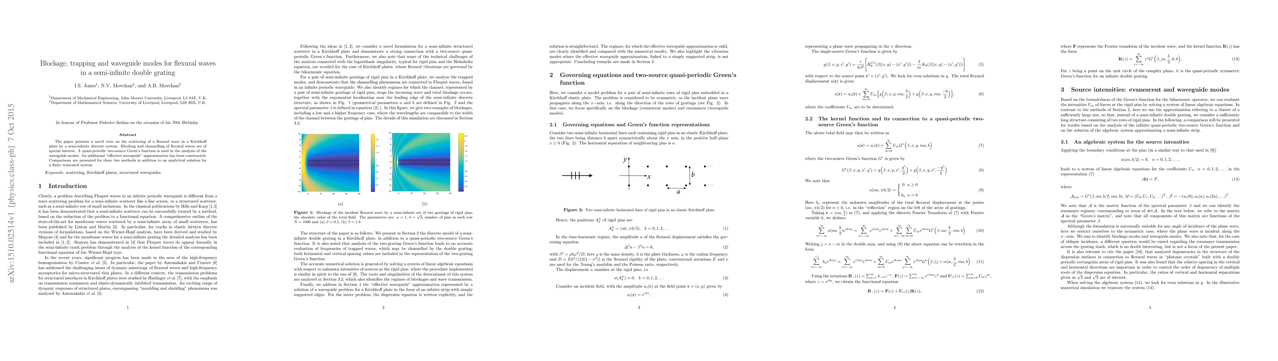 This paper investigates the scattering of flexural waves in a Kirchhoff plate by a semi-infinite double grating, focusing on blockage and waveguide modes. It employs a quasi-periodic two-source Green's function and an "effective waveguide" approximation for analysis, comparing these methods with an analytical solution for a finite system.