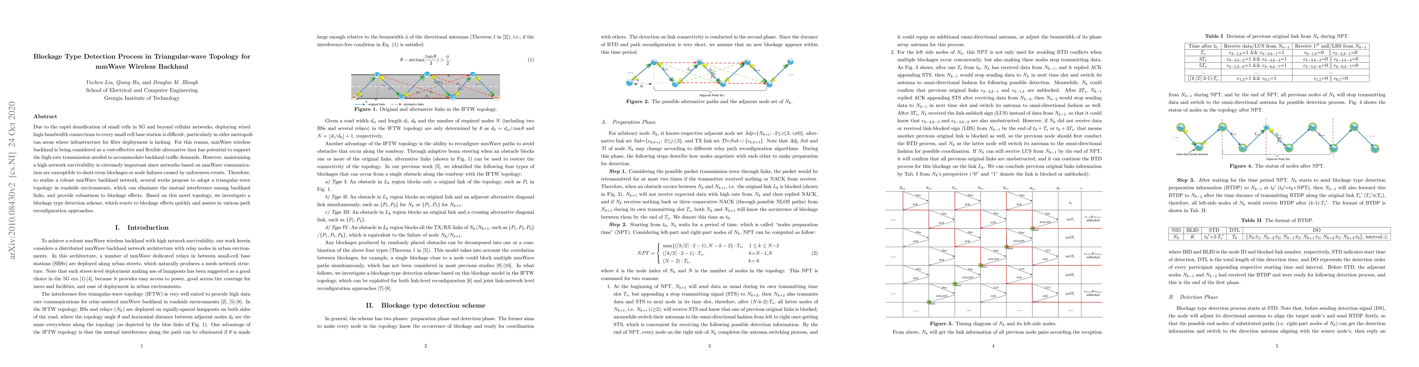 This paper proposes a blockage type detection scheme for mmWave wireless backhaul in triangular-wave topology to enhance network survivability against short-term blockages. The scheme aims to quickly react to blockages and facilitate effective path reconfiguration for maintaining robust communication.