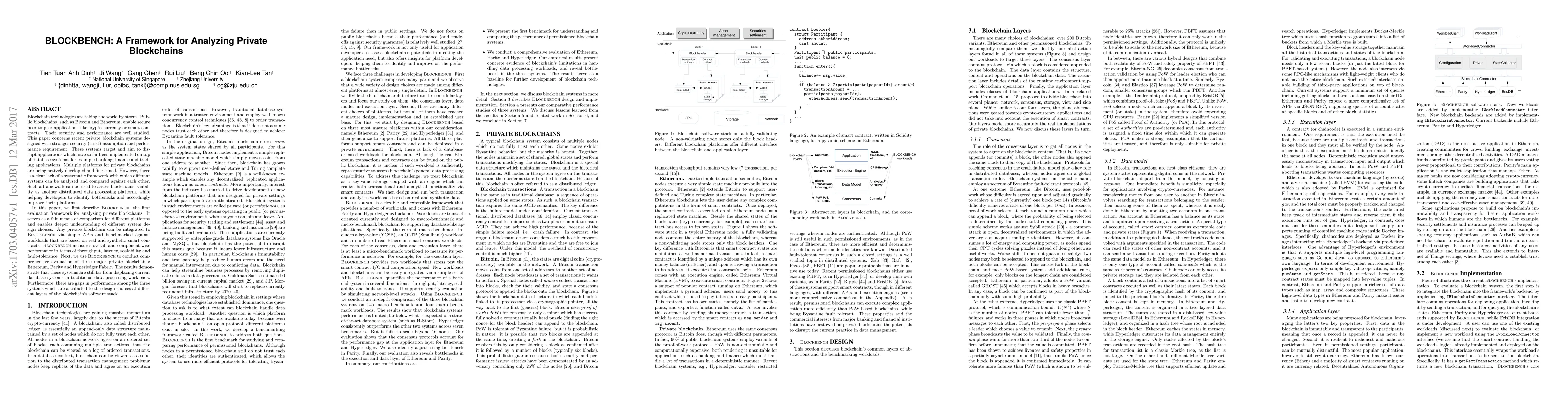 BlockBench is a new evaluation framework designed to analyze and compare private blockchain systems, focusing on performance metrics like throughput, latency, scalability, and fault-tolerance. The study uses BlockBench to evaluate three major private blockchains—Ethereum, Parity, and Hyperledger Fabric—and finds they still lag behind traditional database systems in conventional data processing tasks, with performance gaps due to differing design choices.