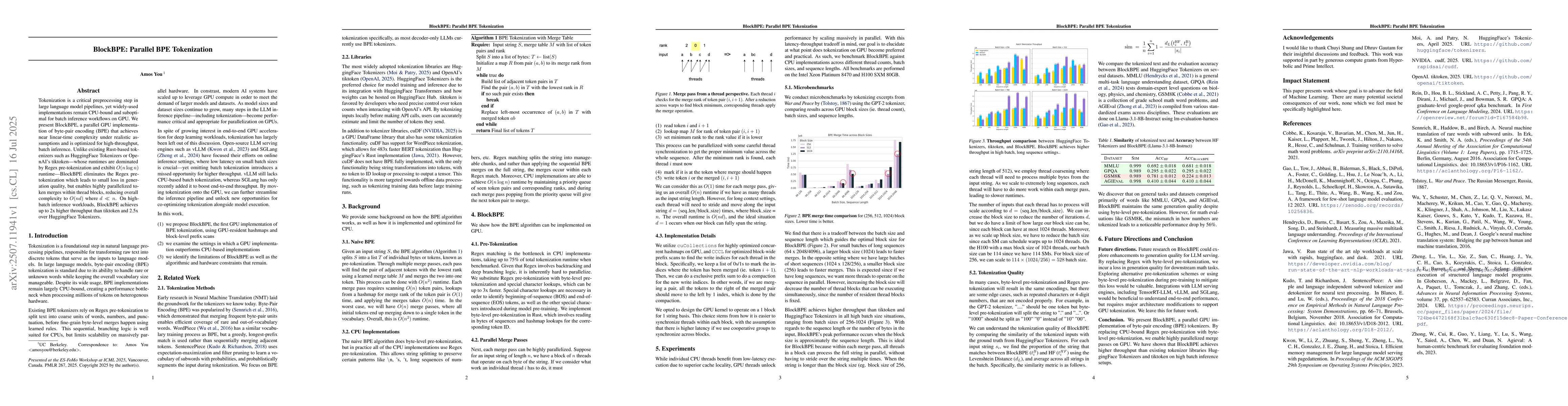 Tokenization is a critical preprocessing step in large language model pipelines, yet widely-used implementations remain CPU-bound and suboptimal for batch inference workflows on GPU. We present BlockBPE, a parallel GPU implementation of byte-pair encoding (BPE) that achieves near linear-time complexity under realistic assumptions and is optimized for high-throughput, batch inference. Unlike existing Rust-based tokenizers such as HuggingFace Tokenizers or OpenAI's tiktoken-whose runtimes are dominated by Regex pre-tokenization and exhibit $O(n \log n)$ runtime-BlockBPE eliminates the Regex pre-tokenization which leads to small loss in generation quality, but enables highly parallelized token merges within thread blocks, reducing overall complexity to $O(nd)$ where $d \ll n$. On high-batch inference workloads, BlockBPE achieves up to 2x higher throughput than tiktoken and 2.5x over HuggingFace Tokenizers.
