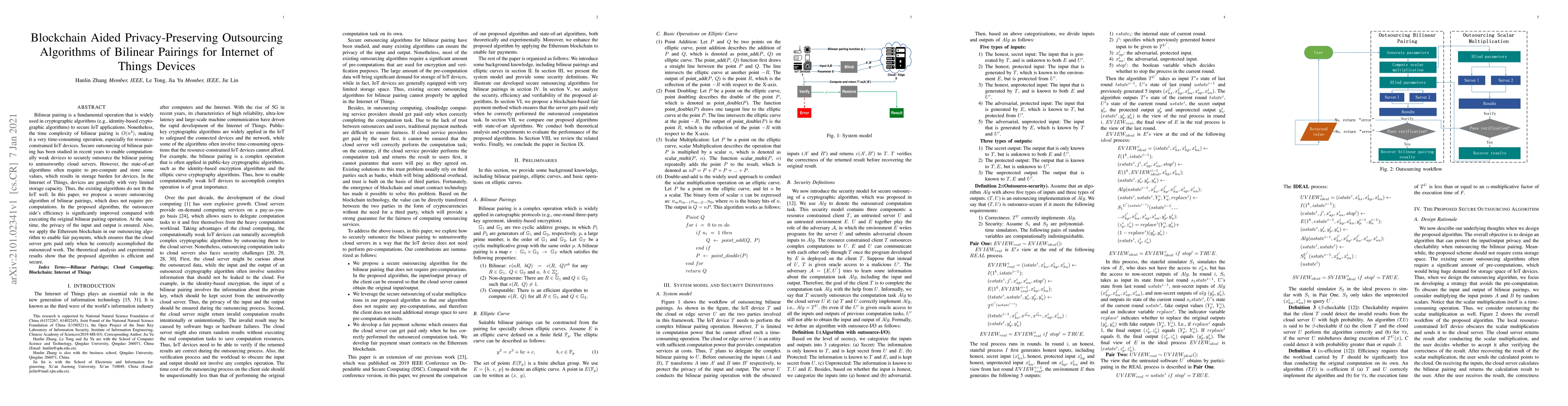 Bilinear pairing is a fundamental operation that is widely used in cryptographic algorithms (e.g., identity-based cryptographic algorithms) to secure IoT applications. Nonetheless, the time complexity of bilinear pairing is $O(n^3)$, making it a very time-consuming operation, especially for resource-constrained IoT devices. Secure outsourcing of bilinear pairing has been studied in recent years to enable computationally weak devices to securely outsource the bilinear pairing to untrustworthy cloud servers. However, the state-of-art algorithms often require to pre-compute and store some values, which results in storage burden for devices. In the Internet of Things, devices are generally with very limited storage capacity. Thus, the existing algorithms do not fit the IoT well. In this paper, we propose a secure outsourcing algorithm of bilinear pairings, which does not require pre-computations. In the proposed algorithm, the outsourcer side's efficiency is significantly improved compared with executing the original bilinear pairing operation. At the same time, the privacy of the input and output is ensured. Also, we apply the Ethereum blockchain in our outsourcing algorithm to enable fair payments, which ensures that the cloud server gets paid only when he correctly accomplished the outsourced work. The theoretical analysis and experimental results show that the proposed algorithm is efficient and secure.