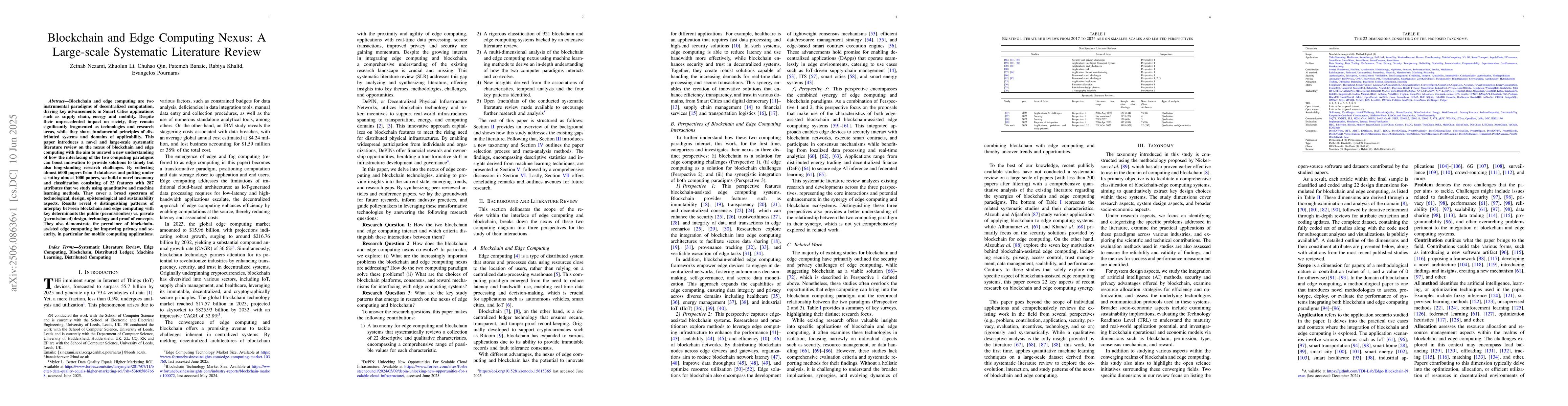 Blockchain and edge computing are two instrumental paradigms of decentralized computation, driving key advancements in Smart Cities applications such as supply chain, energy and mobility. Despite their unprecedented impact on society, they remain significantly fragmented as technologies and research areas, while they share fundamental principles of distributed systems and domains of applicability. This paper introduces a novel and large-scale systematic literature review on the nexus of blockchain and edge computing with the aim to unravel a new understanding of how the interfacing of the two computing paradigms can boost innovation to provide solutions to timely but also long-standing research challenges. By collecting almost 6000 papers from 3 databases and putting under scrutiny almost 1000 papers, we build a novel taxonomy and classification consisting of 22 features with 287 attributes that we study using quantitative and machine learning methods. They cover a broad spectrum of technological, design, epistemological and sustainability aspects. Results reveal 4 distinguishing patterns of interplay between blockchain and edge computing with key determinants the public (permissionless) vs. private (permissioned) design, technology and proof of concepts. They also demonstrate the prevalence of blockchain-assisted edge computing for improving privacy and security, in particular for mobile computing applications.