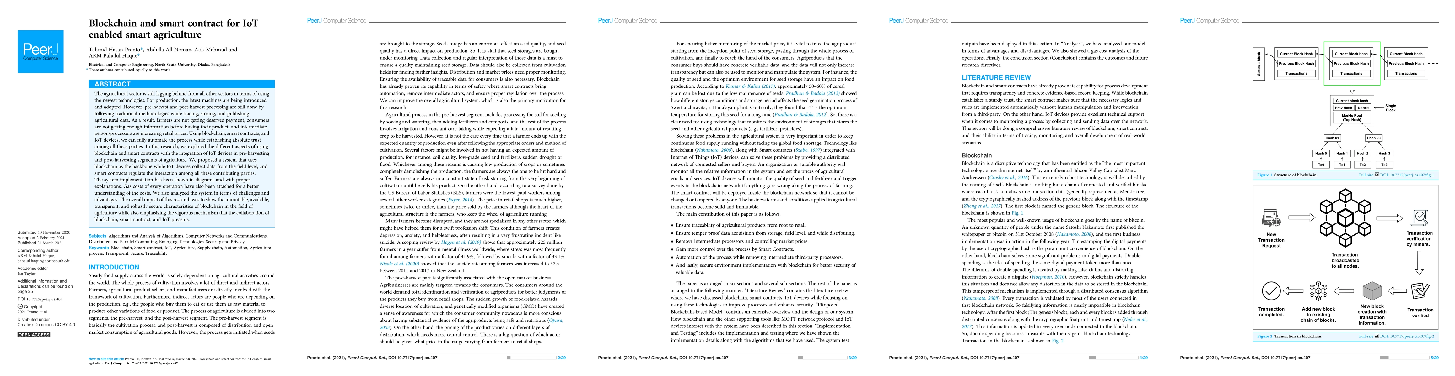 The agricultural sector is still lagging behind from all other sectors in terms of using the newest technologies. For production, the latest machines are being introduced and adopted. However, pre-harvest and post-harvest processing are still done by following traditional methodologies while tracing, storing, and publishing agricultural data. As a result, farmers are not getting deserved payment, consumers are not getting enough information before buying their product, and intermediate person/processors are increasing retail prices. Using blockchain, smart contracts, and IoT devices, we can fully automate the process while establishing absolute trust among all these parties. In this research, we explored the different aspects of using blockchain and smart contracts with the integration of IoT devices in pre-harvesting and post-harvesting segments of agriculture. We proposed a system that uses blockchain as the backbone while IoT devices collect data from the field level, and smart contracts regulate the interaction among all these contributing parties. The system implementation has been shown in diagrams and with proper explanations. Gas costs of every operation have also been attached for a better understanding of the costs. We also analyzed the system in terms of challenges and advantages. The overall impact of this research was to show the immutable, available, transparent, and robustly secure characteristics of blockchain in the field of agriculture while also emphasizing the vigorous mechanism that the collaboration of blockchain, smart contract, and IoT presents.