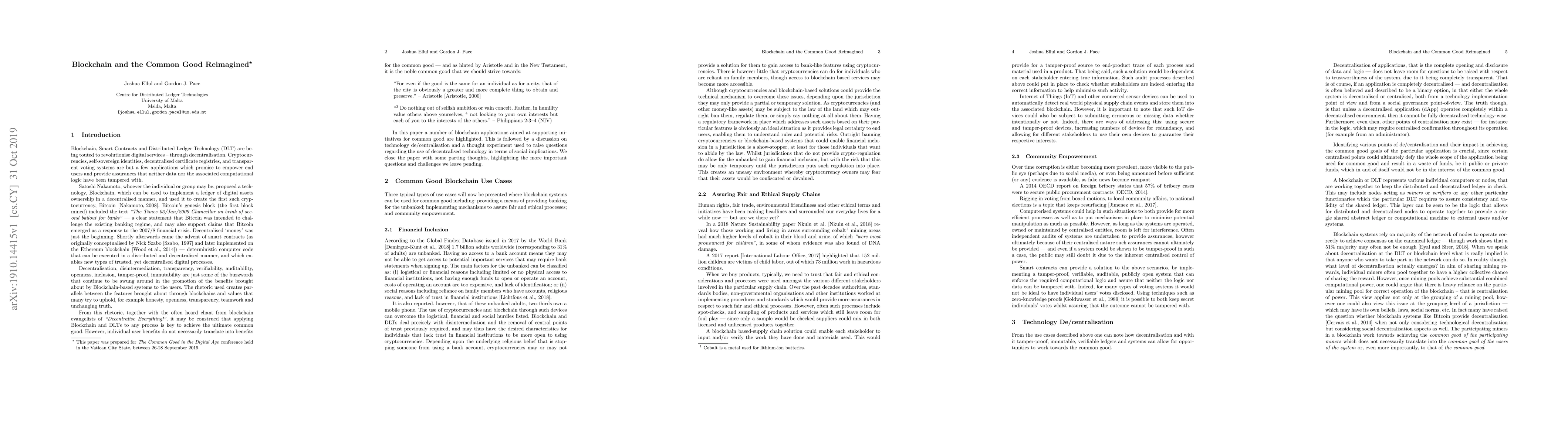 This paper explores blockchain's potential in supporting common good initiatives, highlighting applications like decentralized identity systems and transparent voting. It also critically examines the social implications of technology decentralization, questioning its impact on societal values and structures.