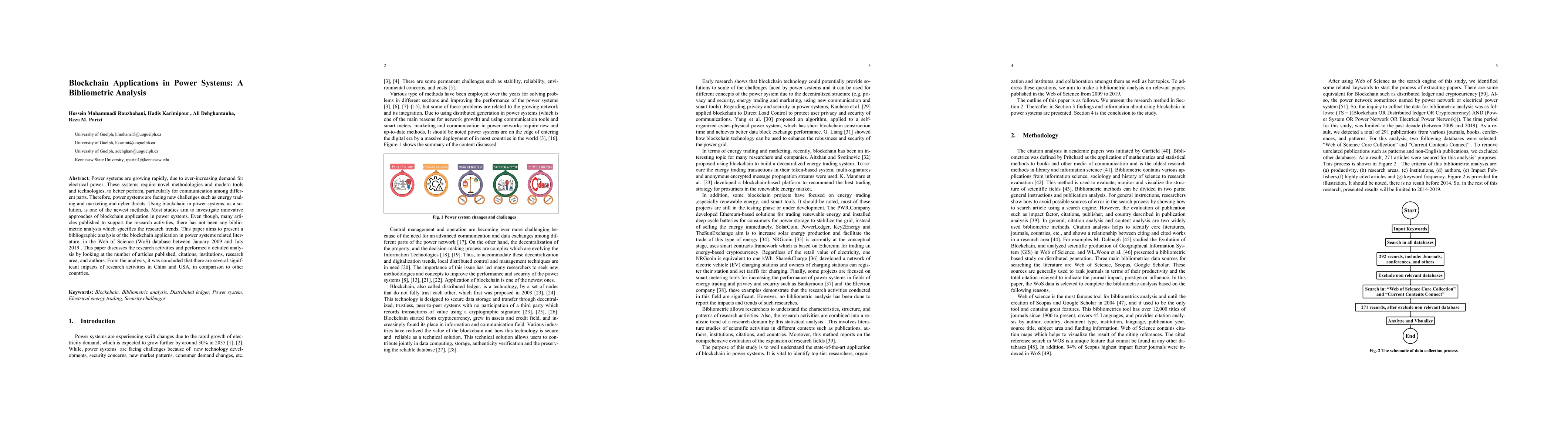 This paper conducts a bibliometric analysis of blockchain applications in power systems, examining publications from 2009 to 2019 in the Web of Science database. It highlights the research trends, noting significant contributions from China and the USA, and analyzes publication numbers, citations, institutions, research areas, and authorship.