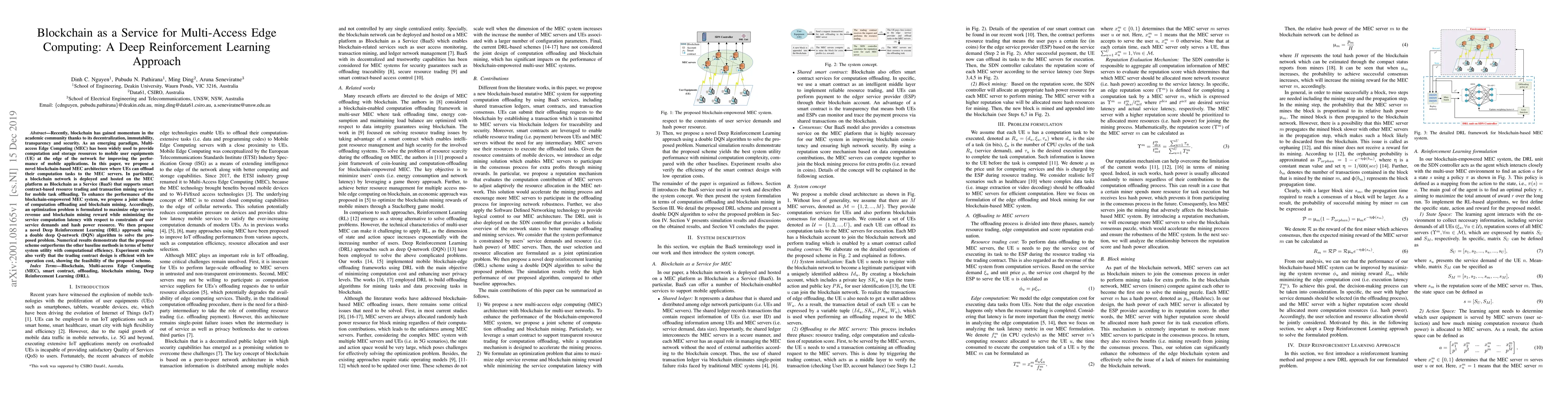 This paper proposes a blockchain-based Multi-access Edge Computing (MEC) architecture where UEs offload tasks to MEC servers via a Blockchain as a Service (BaaS) platform. A Deep Reinforcement Learning (DRL) approach is introduced to optimize computation offloading and blockchain mining, achieving better system utility and efficiency.