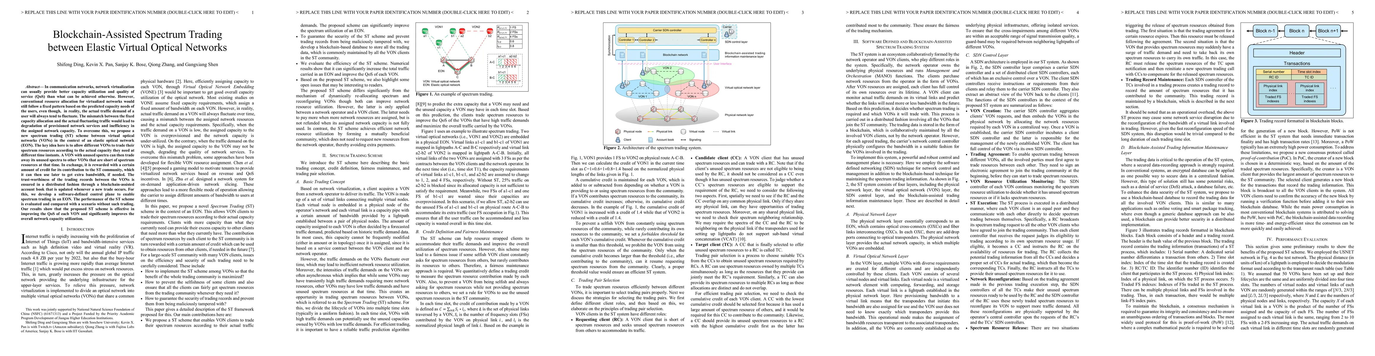 In communication networks, network virtualization can usually provide better capacity utilization and quality of service (QoS) than what can be achieved otherwise. However, conventional resource allocation for virtualized networks would still follow a fixed pattern based on the predicted capacity needs of the users, even though, in reality, the actual traffic demand of a user will always tend to fluctuate. The mismatch between the fixed capacity allocation and the actual fluctuating traffic would lead to degradation of provisioned network services and inefficiency in the assigned network capacity. To overcome this, we propose a new spectrum trading (ST) scheme between virtual optical networks (VONs) in the context of an elastic optical network (EON). The key idea here is to allow different VONs to trade their spectrum resources according to the actual capacity they need at different time instants. A VON with unused spectra can then trade away its unused spectra to other VONs that are short of spectrum resources at that time. In exchange, it is rewarded with a certain amount of credit for its contribution to the ST community, which it can then use later to get extra bandwidth, if needed. The trust-worthiness of the trading records between the VONs is ensured in a distributed fashion through a blockchain-assisted account book that is updated whenever a new trade occurs. For this, we develop a software-defined control plane to enable spectrum trading in an EON. The performance of the ST scheme is evaluated and compared with a scenario without such trading. Our results show that the proposed ST scheme is effective in improving the QoS of each VON and significantly improves the overall network capacity utilization.
