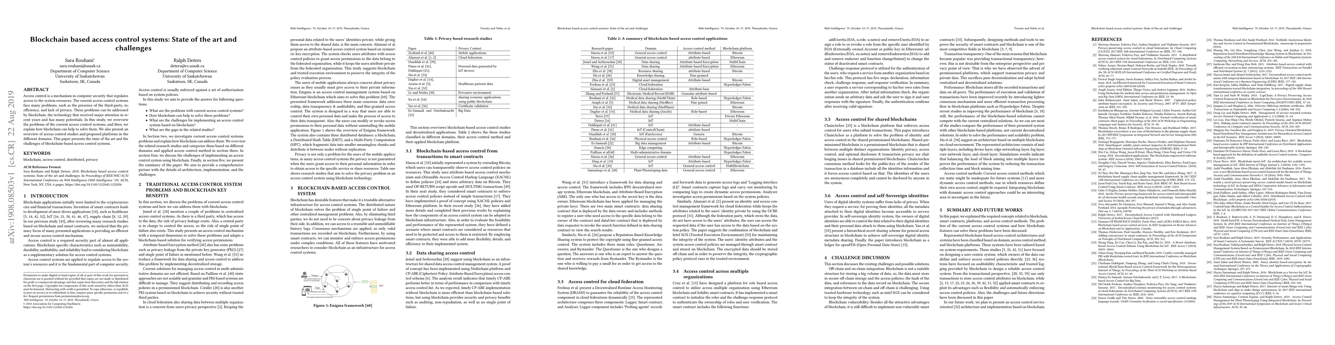 Access to the system resources. The current access control systems face many problems, such as the presence of the third-party, inefficiency, and lack of privacy. These problems can be addressed by blockchain, the technology that received major attention in recent years and has many potentials. In this study, we overview the problems of the current access control systems, and then, we explain how blockchain can help to solve them. We also present an overview of access control studies and proposed platforms in different domains. This paper presents the state of the art and the challenges of blockchain-based access control systems.