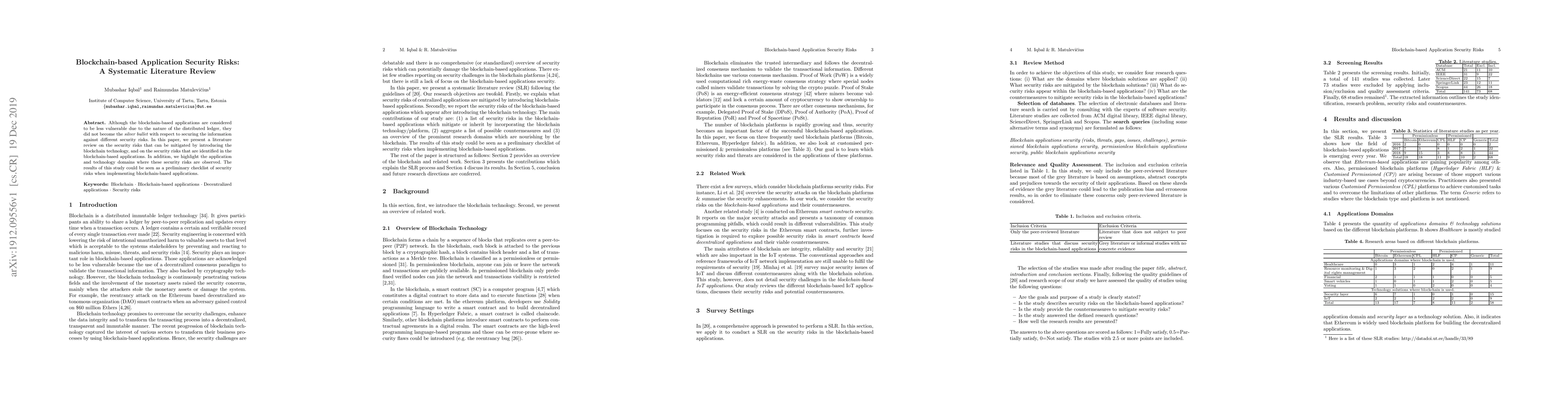 This paper systematically reviews the security risks in blockchain-based applications, noting that while blockchain offers enhanced security, it is not immune to vulnerabilities. The study identifies specific security risks and highlights the domains where these risks are prevalent, providing a preliminary checklist for developers.