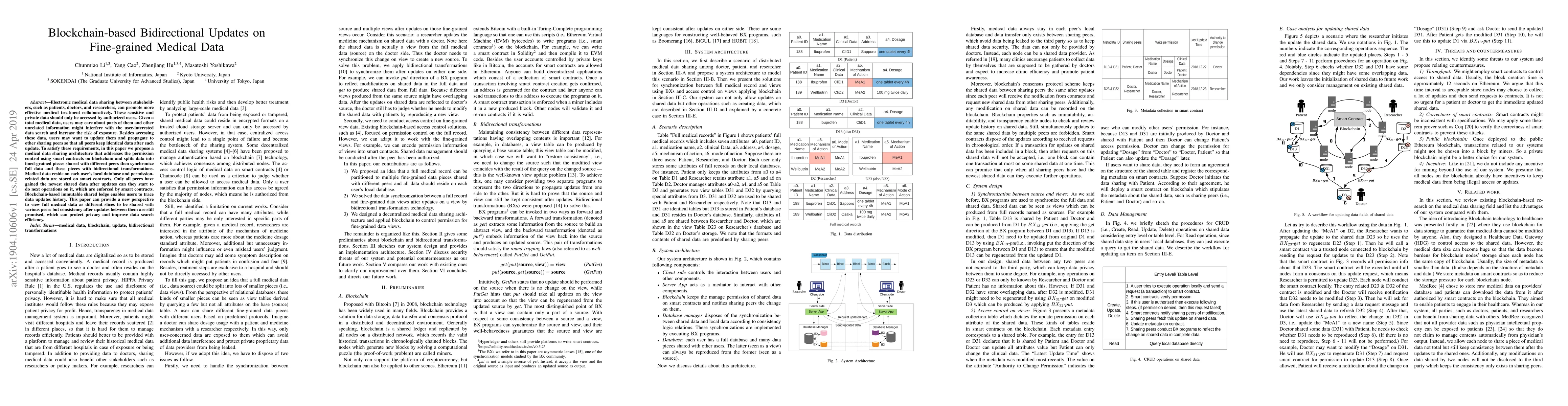 Electronic medical data sharing between stakeholders, such as patients, doctors, and researchers, can promote more effective medical treatment collaboratively. These sensitive and private data should only be accessed by authorized users. Given a total medical data, users may care about parts of them and other unrelated information might interfere with the user interested data search and increase the risk of exposure. Besides accessing these data, users may want to update them and propagate to other sharing peers so that all peers keep identical data after each update. To satisfy these requirements, in this paper we propose a medical data sharing architecture that addresses the permission control using smart contracts on the blockchain and splits data into fined grained pieces shared with different peers then synchronize full data and these pieces with bidirectional transformations. Medical data reside on each user\'s local database and permission related data are stored on smart contracts. Only all peers have gained the newest shared data after updates can they start to do next operations on it, which are enforced by smart contracts. Blockchain based immutable shared ledge enables users to trace data updates history. This paper can provide a new perspective to view full medical data as different slices to be shared with various peers but consistency after updates between them are still promised, which can protect the privacy and improve data search efficiency.