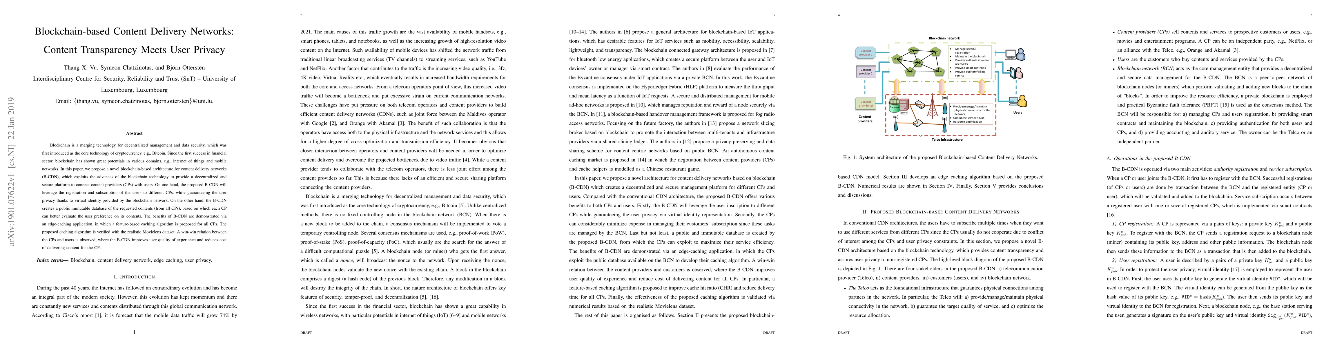 This paper proposes a blockchain-based architecture for content delivery networks (B-CDN) that leverages blockchain for decentralized management and secure connections between providers and users, ensuring user privacy through virtual identities while maintaining a transparent and immutable database of content requests. The B-CDN's caching algorithm, tested with the Movielens dataset, demonstrates improved user experience and reduced content delivery costs for providers.