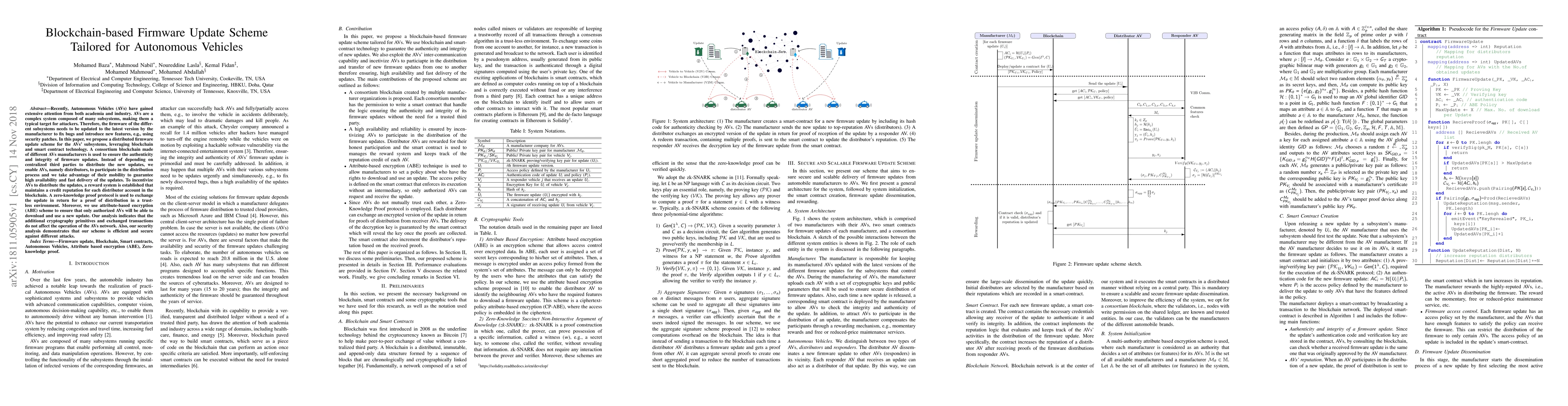 This paper proposes a blockchain-based distributed firmware update scheme for autonomous vehicles, utilizing consortium blockchain and smart contracts to ensure update authenticity and integrity. The scheme incentivizes AVs to distribute updates via a credit-based reward system, employing zero-knowledge proofs and attribute-based encryption to secure and authorize updates.
