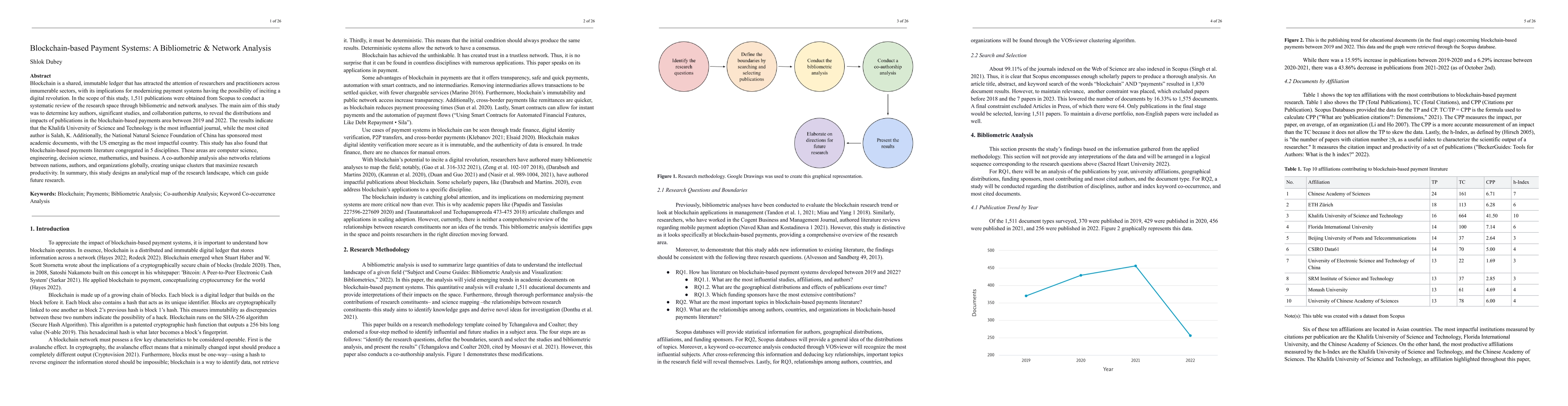 This study conducts a bibliometric and network analysis of 1,511 blockchain-based payment publications from 2019 to 2022, identifying key authors, influential studies, and collaboration patterns. The Khalifa University of Science and Technology is the most influential journal, with Salah, K. as the most cited author, and the US as the most impactful country.