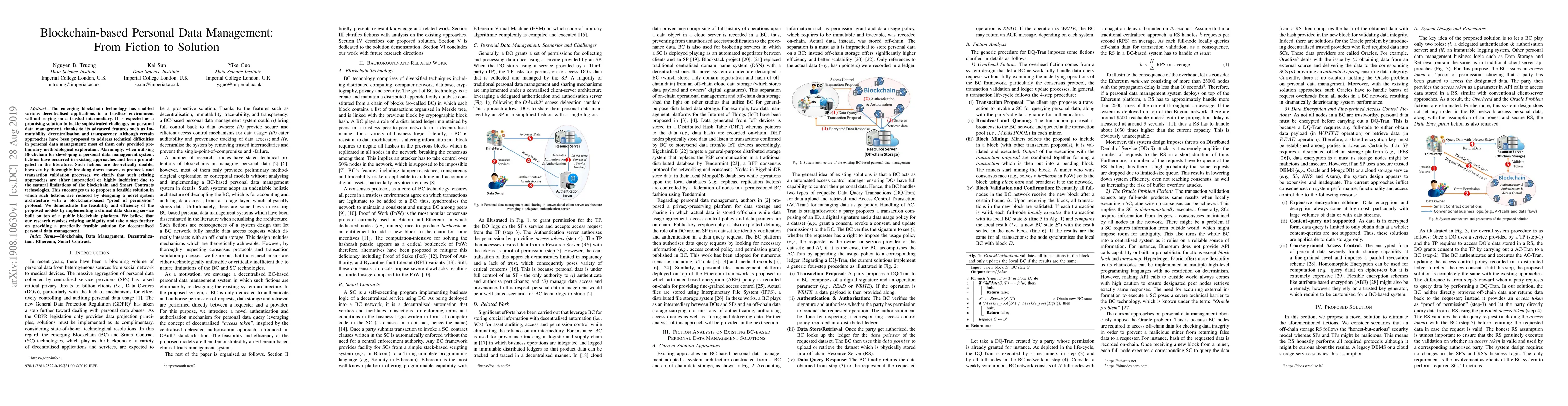 The research distinguishes itself by identifying and addressing critical fictions in existing blockchain-based personal data management systems, proposing a new system architecture that significantly improves feasibility and efficiency.