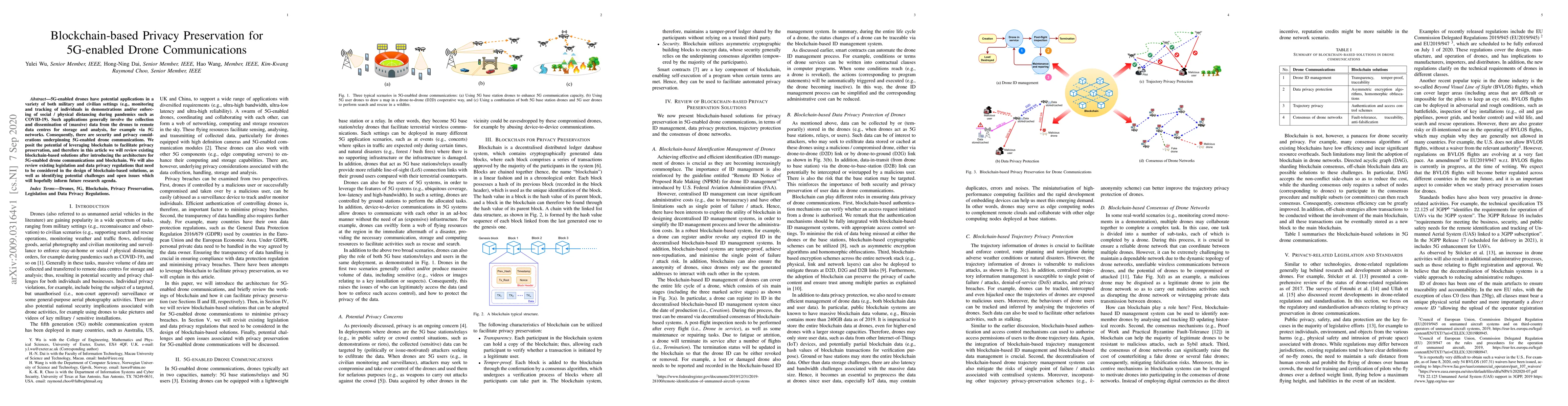 5G-enabled drones have potential applications in a variety of both military and civilian settings (e.g., monitoring and tracking of individuals in demonstrations and/or enforcing of social / physical distancing during pandemics such as COVID-19). Such applications generally involve the collection and dissemination of (massive) data from the drones to remote data centres for storage and analysis, for example via 5G networks. Consequently, there are security and privacy considerations underpinning 5G-enabled drone communications. We posit the potential of leveraging blockchain to facilitate privacy preservation, and therefore in this article we will review existing blockchain-based solutions after introducing the architecture for 5G-enabled drone communications and blockchain. We will also review existing legislation and data privacy regulations that need to be considered in the design of blockchain-based solutions, as well as identifying potential challenges and open issues which will hopefully inform future research agenda.