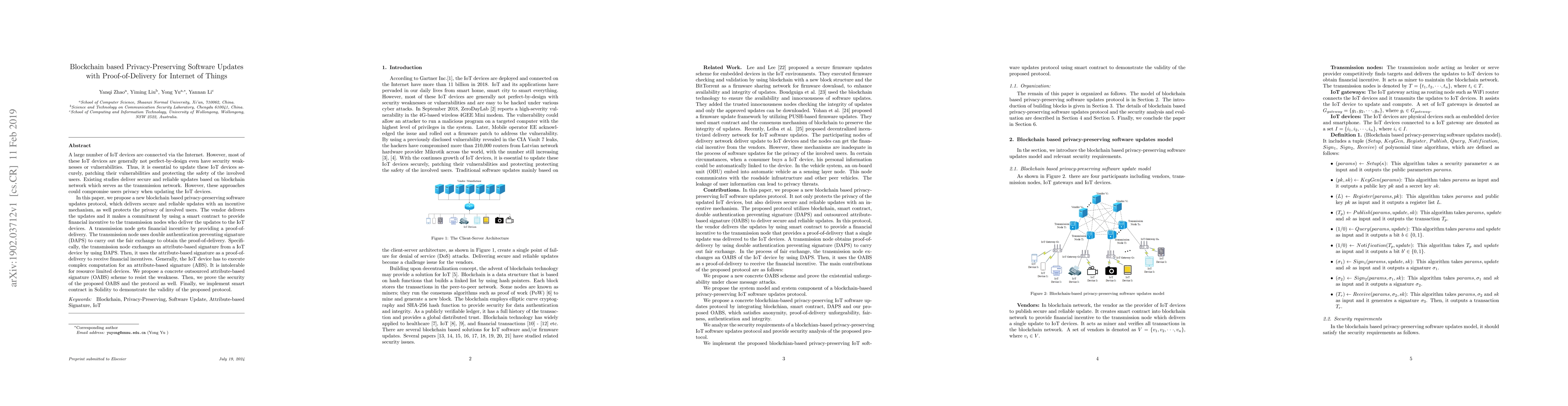 This paper proposes a blockchain-based protocol for privacy-preserving software updates for IoT devices, using a smart contract to incentivize delivery nodes and a double authentication preventing signature (DAPS) mechanism to ensure privacy. It also introduces an outsourced attribute-based signature (OABS) scheme to address the computational limitations of IoT devices.