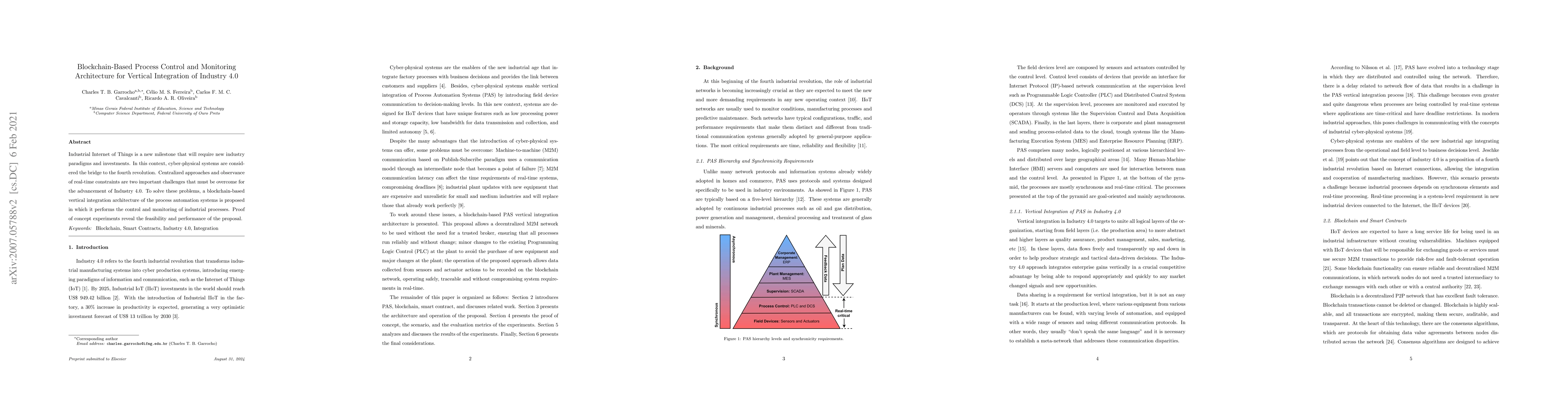 The paper proposes a blockchain-based architecture for Industry 4.0, addressing real-time constraints and centralization challenges in industrial process control and monitoring. Experiments demonstrate the feasibility and performance of the proposed solution.