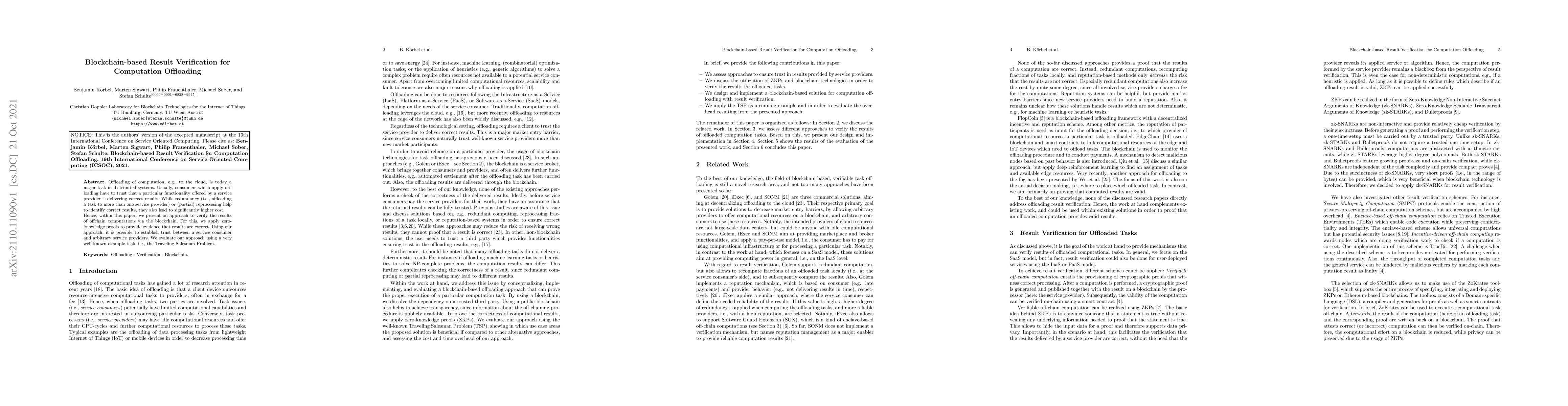 Offloading of computation, e.g., to the cloud, is today a major task in distributed systems. Usually, consumers which apply offloading have to trust that a particular functionality offered by a service provider is delivering correct results. While redundancy (i.e., offloading a task to more than one service provider) or (partial) reprocessing help to identify correct results, they also lead to significantly higher cost. Hence, within this paper, we present an approach to verify the results of offchain computations via the blockchain. For this, we apply zero-knowledge proofs to provide evidence that results are correct. Using our approach, it is possible to establish trust between a service consumer and arbitrary service providers. We evaluate our approach using a very well-known example task, i.e., the Traveling Salesman Problem.