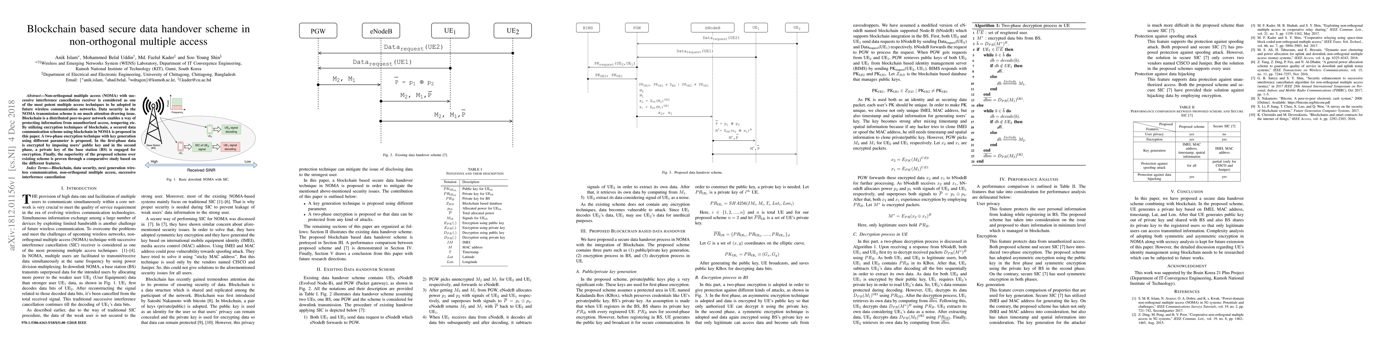 This paper proposes a secure data handover scheme in non-orthogonal multiple access (NOMA) using blockchain technology, employing a two-phase encryption technique for enhanced security. The scheme's effectiveness is demonstrated through a comparative analysis showing its superiority over existing methods.