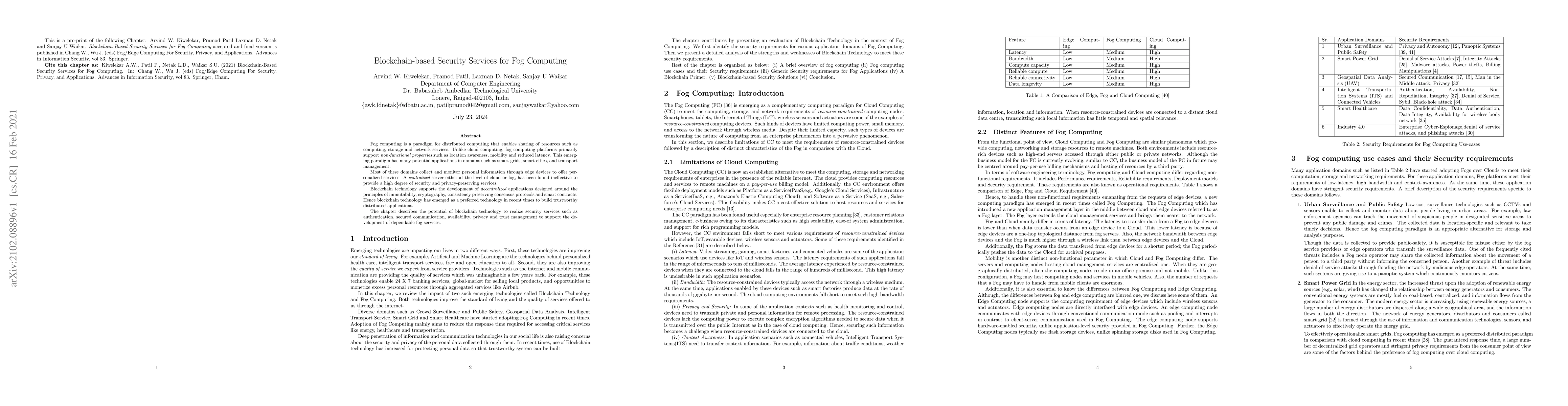 Fog computing is a paradigm for distributed computing that enables sharing of resources such as computing, storage and network services. Unlike cloud computing, fog computing platforms primarily support {\em non-functional properties} such as location awareness, mobility and reduced latency. This emerging paradigm has many potential applications in domains such as smart grids, smart cities, and transport management. Most of these domains collect and monitor personal information through edge devices to offer personalized services. A {\em centralized} server either at the level of cloud or fog, has been found ineffective to provide a high degree of security and privacy-preserving services. Blockchain technology supports the development of {\em decentralized} applications designed around the principles of immutability, cryptography, consistency preserving consensus protocols and smart contracts. Hence blockchain technology has emerged as a preferred technology in recent times to build trustworthy distributed applications. The chapter describes the potential of blockchain technology to realize security services such as authentication, secured communication, availability, privacy and trust management to support the development of dependable fog services.