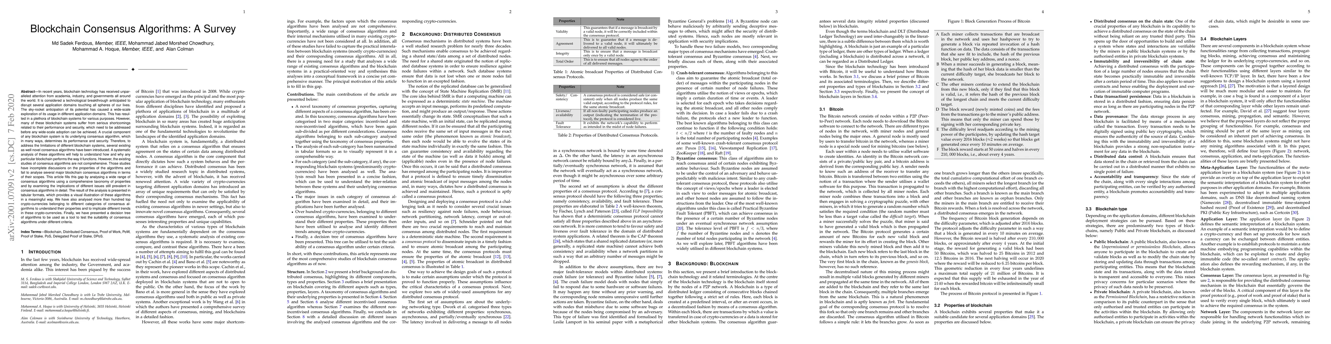 This paper provides a comprehensive survey of blockchain consensus algorithms, analyzing a wide range of algorithms to address performance and security shortcomings. It presents a detailed taxonomy and decision tree for evaluating the suitability of different consensus algorithms for various blockchain applications.
