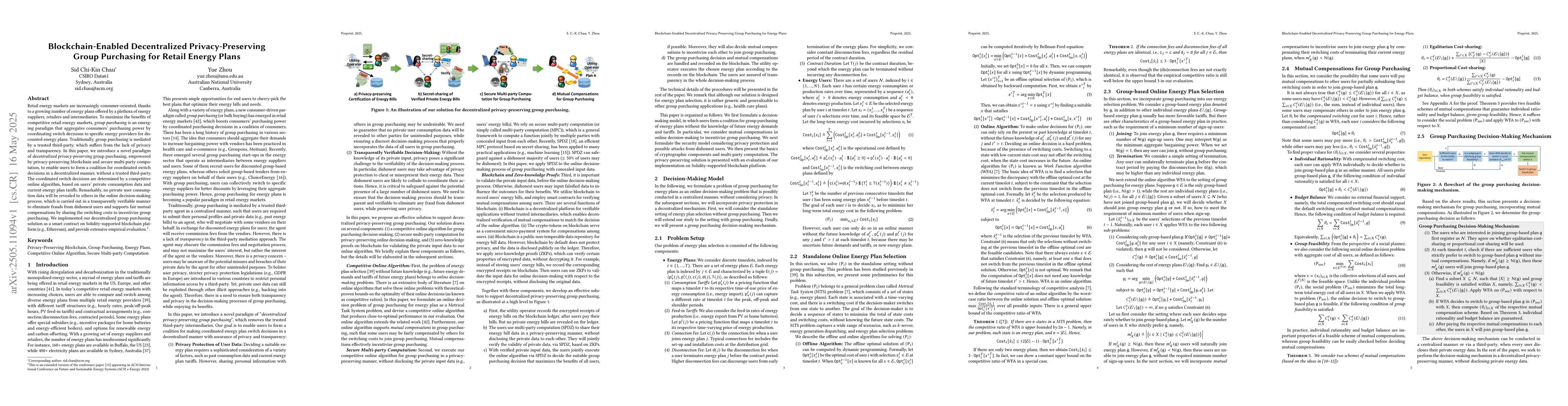 The research introduces a decentralized privacy-preserving group purchasing solution for retail energy markets, utilizing blockchain and secure multi-party computation to coordinate switch decisions among users without a trusted third-party.