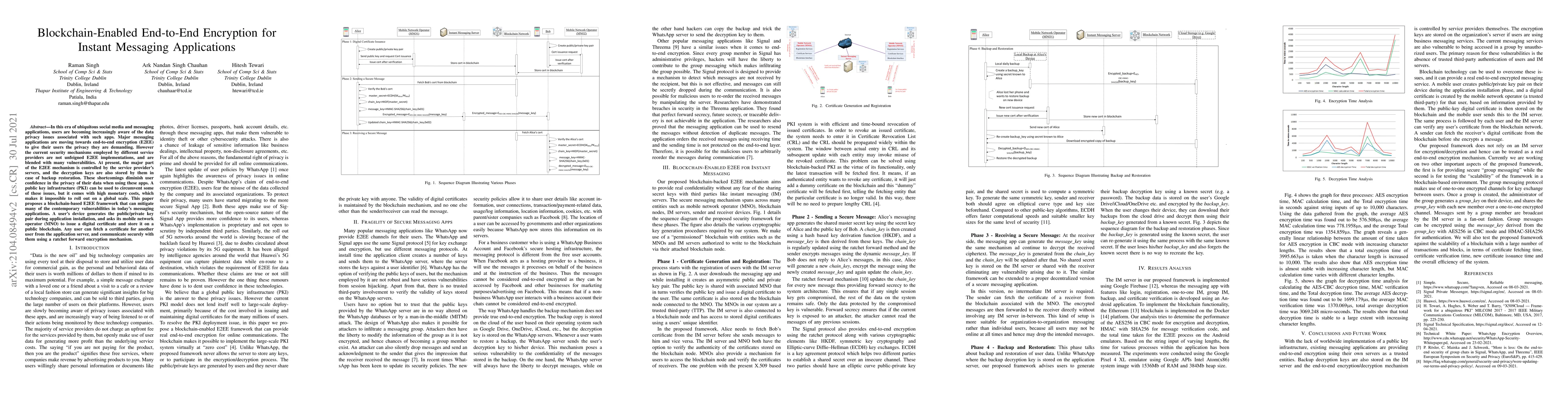 The paper proposes a blockchain-based end-to-end encryption framework for instant messaging applications to enhance data privacy, addressing vulnerabilities in current E2EE implementations by decentralizing key management and reducing reliance on service providers. The framework uses blockchain to store digital certificates issued by mobile network operators, ensuring secure and private communications.