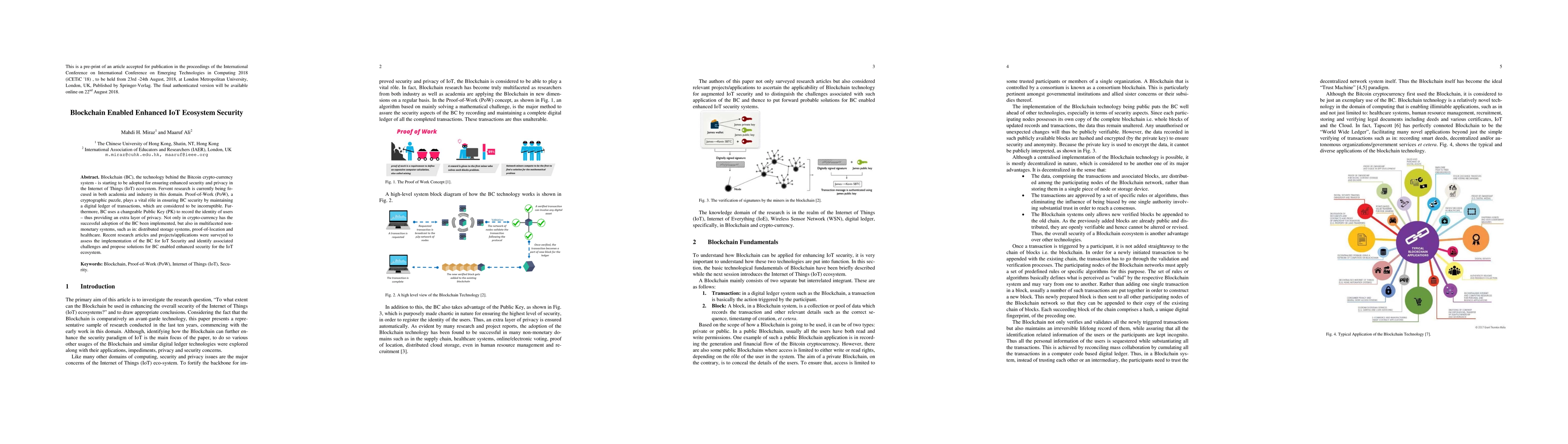 This paper explores the use of blockchain technology to enhance security and privacy in the Internet of Things (IoT) ecosystem. It surveys recent research and applications to identify challenges and propose solutions for implementing blockchain to secure IoT systems.