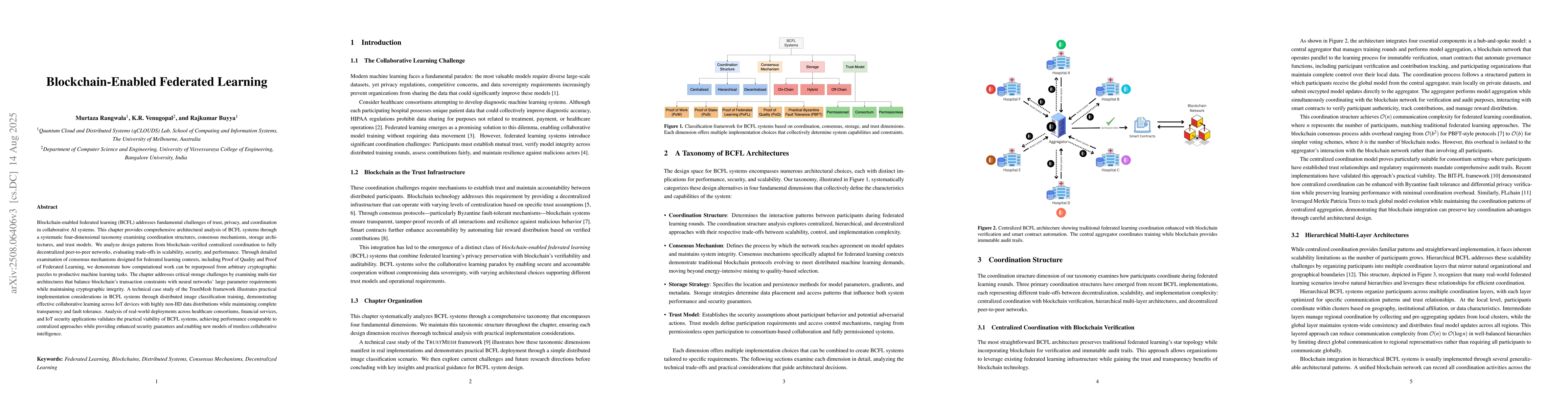 The paper provides a comprehensive architectural analysis of Blockchain-Enabled Federated Learning (BCFL) systems through a four-dimensional taxonomy examining coordination structures, consensus mechanisms, storage architectures, and trust models.