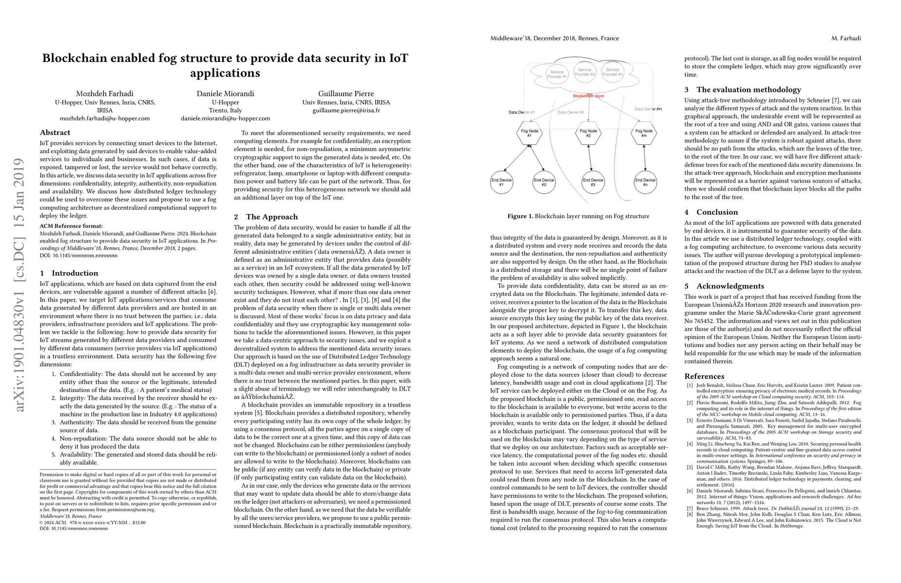 This research paper proposes a blockchain-enabled fog structure to enhance data security in IoT applications, addressing confidentiality, integrity, authenticity, non-repudiation, and availability.