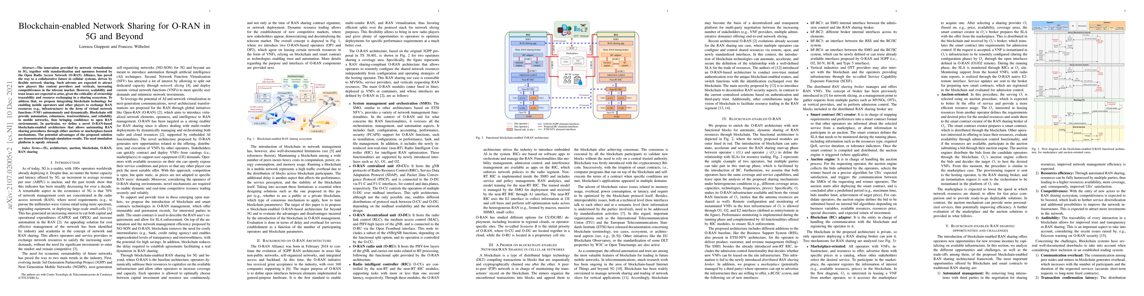 The innovation provided by network virtualization in 5G, together with standardization and openness boosted by the Open Radio Access Network (O-RAN) Alliance, has paved the way to a collaborative future in cellular systems, driven by flexible network sharing. Such advents are expected to attract new players like content providers and verticals, increasing competitiveness in the telecom market. However, scalability and trust issues are expected to arise, given the criticality of ownership traceability and resource exchanging in a sharing ecosystem. To address that, we propose integrating blockchain technology for enabling mobile operators and other players to exchange RAN resources (e.g., infrastructure) in the form of virtual network functions (VNF) autonomously and dynamically. Blockchain will provide automation, robustness, trustworthiness, and reliability to mobile networks, thus bringing confidence to open RAN environments. In particular, we define a novel O-RAN-based blockchain-enabled architecture that allows automating RAN sharing procedures through either auction or marketplace-based mechanisms. The potential advantages of the proposed solution are demonstrated through simulation results. The used simulation platform is openly released.