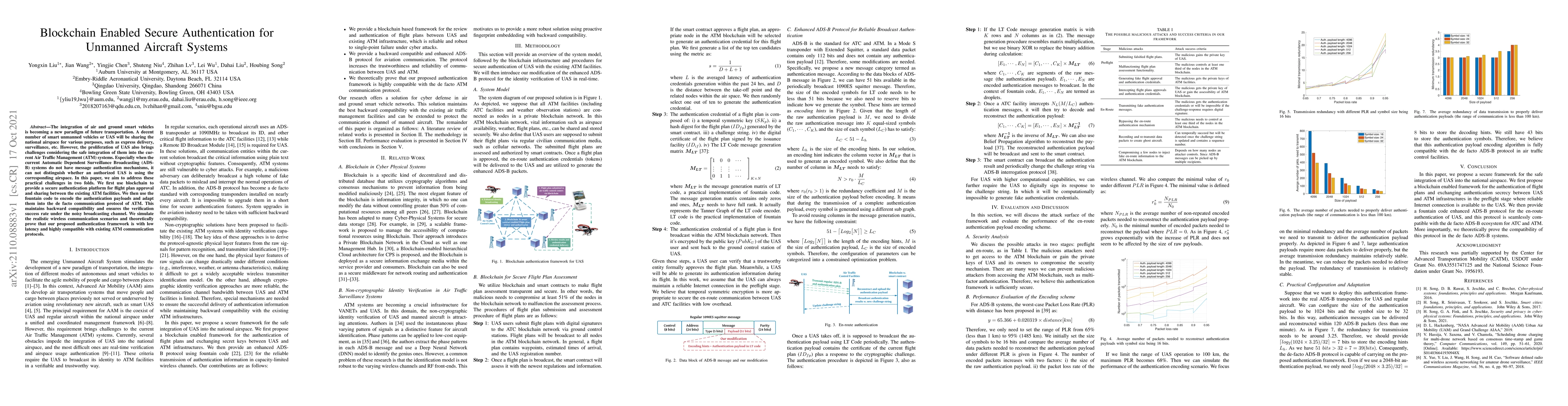 This research proposes a blockchain-based secure authentication system for unmanned aircraft systems (UAS), addressing safety concerns in shared airspace. It uses fountain codes to encode authentication payloads, ensuring compatibility with existing Air Traffic Management (ATM) protocols, and demonstrates low latency and high verification success rates in simulated scenarios.