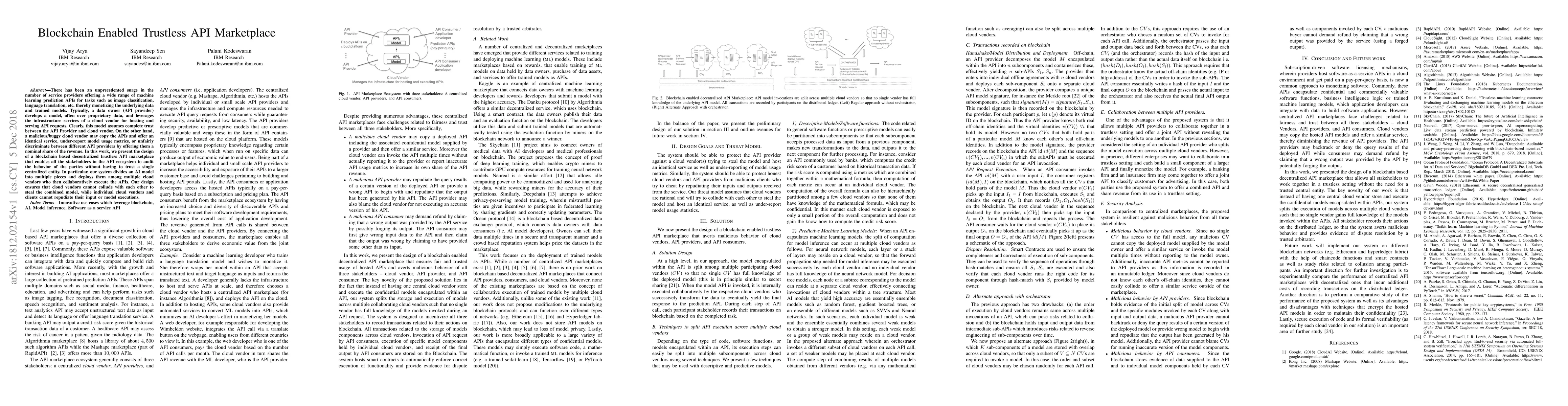There has been an unprecedented surge in the number of service providers offering a wide range of machine learning prediction APIs for tasks such as image classification, language translation, etc. thereby monetizing the underlying data and trained models. Typically, a data owner (API provider) develops a model, often over proprietary data, and leverages the infrastructure services of a cloud vendor for hosting and serving API requests. Clearly, this model assumes complete trust between the API Provider and cloud vendor. On the other hand, a malicious/buggy cloud vendor may copy the APIs and offer an identical service, under-report model usage metrics, or unfairly discriminate between different API providers by offering them a nominal share of the revenue. In this work, we present the design of a blockchain based decentralized trustless API marketplace that enables all the stakeholders in the API ecosystem to audit the behavior of the parties without having to trust a single centralized entity. In particular, our system divides an AI model into multiple pieces and deploys them among multiple cloud vendors who then collaboratively execute the APIs. Our design ensures that cloud vendors cannot collude with each other to steal the combined model, while individual cloud vendors and clients cannot repudiate their input or model executions.