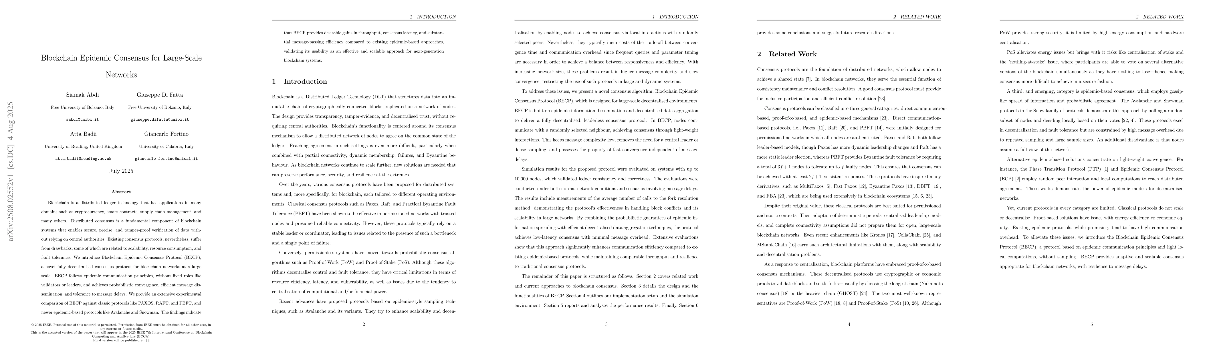 The main technical contribution is the Blockchain Epidemic Consensus Protocol (BECP), a novel, fully decentralized consensus protocol for large-scale blockchain networks that follows epidemic communication principles.