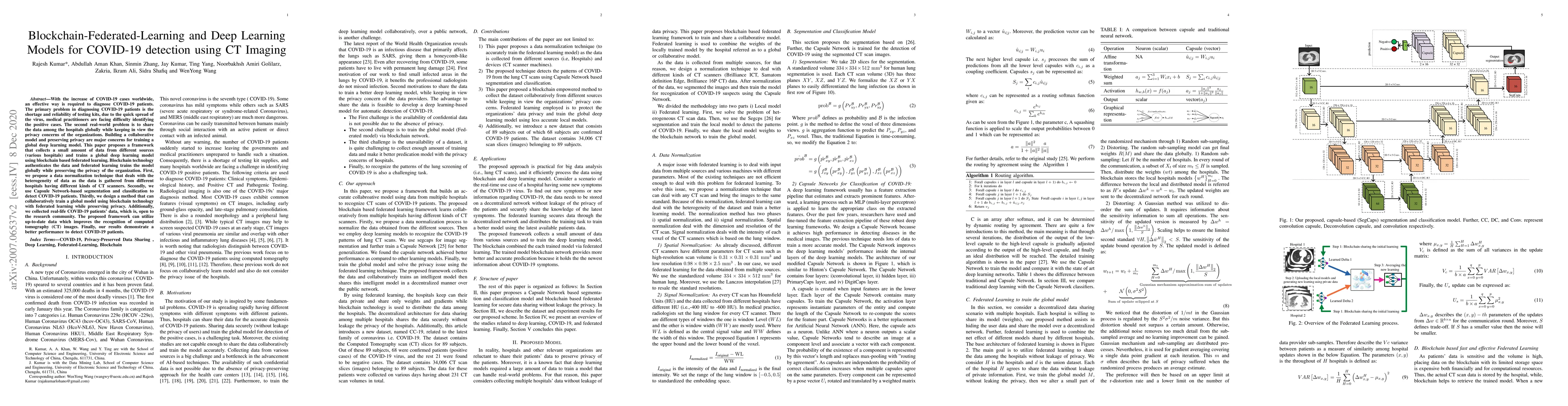With the increase of COVID-19 cases worldwide, an effective way is required to diagnose COVID-19 patients. The primary problem in diagnosing COVID-19 patients is the shortage and reliability of testing kits, due to the quick spread of the virus, medical practitioners are facing difficulty identifying the positive cases. The second real-world problem is to share the data among the hospitals globally while keeping in view the privacy concerns of the organizations. Building a collaborative model and preserving privacy are major concerns for training a global deep learning model. This paper proposes a framework that collects a small amount of data from different sources (various hospitals) and trains a global deep learning model using blockchain based federated learning. Blockchain technology authenticates the data and federated learning trains the model globally while preserving the privacy of the organization. First, we propose a data normalization technique that deals with the heterogeneity of data as the data is gathered from different hospitals having different kinds of CT scanners. Secondly, we use Capsule Network-based segmentation and classification to detect COVID-19 patients. Thirdly, we design a method that can collaboratively train a global model using blockchain technology with federated learning while preserving privacy. Additionally, we collected real-life COVID-19 patients data, which is, open to the research community. The proposed framework can utilize up-to-date data which improves the recognition of computed tomography (CT) images. Finally, our results demonstrate a better performance to detect COVID-19 patients.