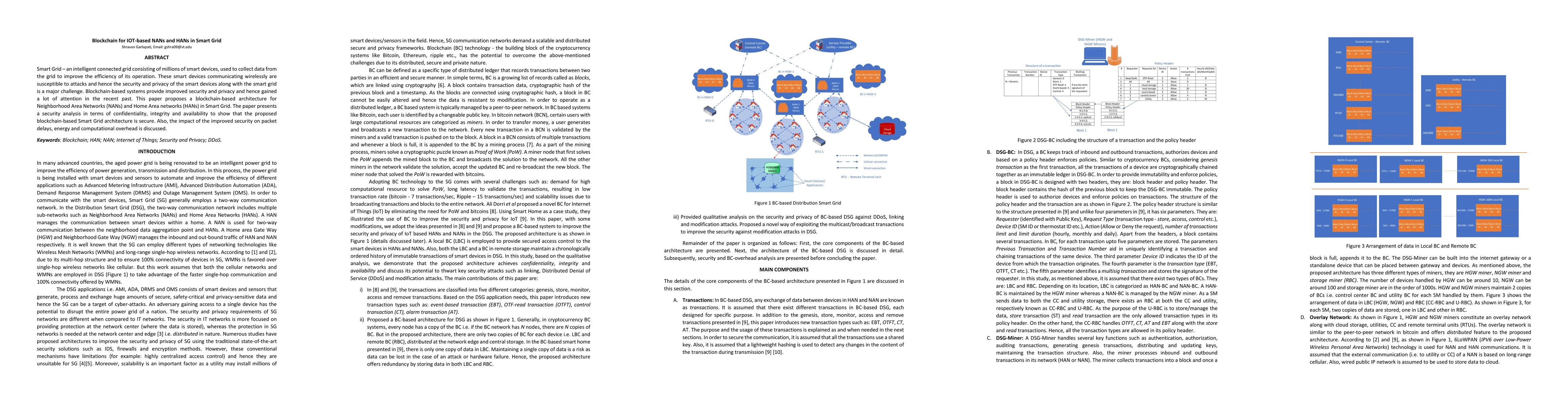 Smart Grid, an intelligent connected grid consisting of millions of smart devices, used to collect data from the grid to improve the efficiency of its operation. These smart devices communicating wirelessly are susceptible to attacks and hence the security and privacy of the smart devices along with the smart grid is a major challenge. Blockchain-based systems provide improved security and privacy and hence gained a lot of attention in the recent past. This paper proposes a blockchain-based architecture for Neighborhood Area Networks (NANs) and Home Area networks (HANs) in Smart Grid. The paper presents a security analysis in terms of confidentiality, integrity and availability to show that the proposed blockchain-based Smart Grid architecture is secure. Also, the impact of the improved security on packet delays, energy and computational overhead is discussed.