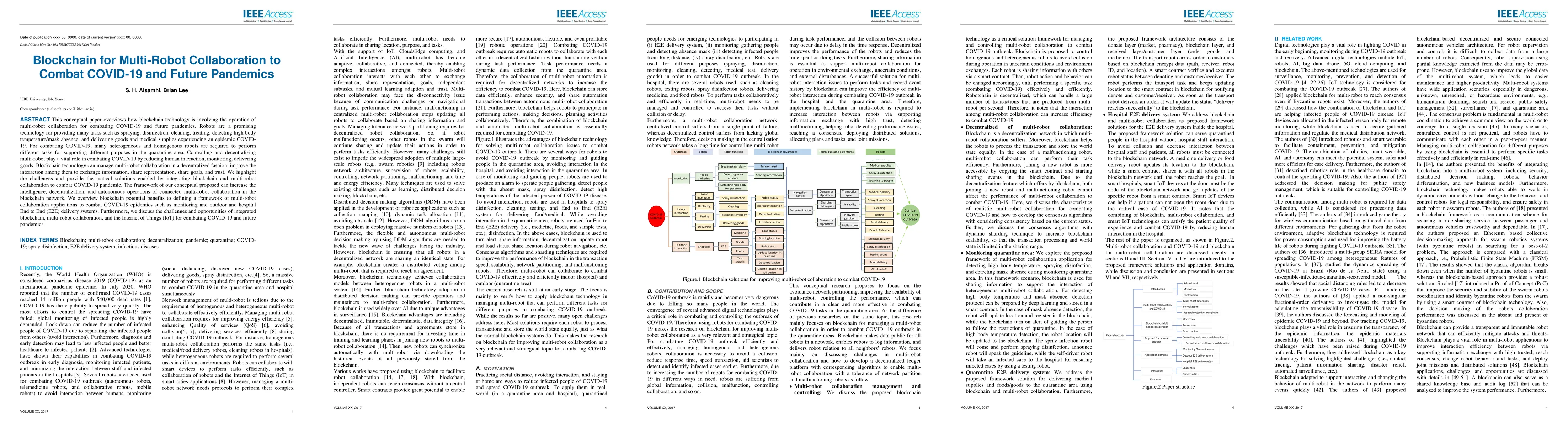 This conceptual paper overviews how blockchain technology is involving the operation of multi-robot collaboration for combating COVID-19 and future pandemics. Robots are a promising technology for providing many tasks such as spraying, disinfection, cleaning, treating, detecting high body temperature/mask absence, and delivering goods and medical supplies experiencing an epidemic COVID-19. For combating COVID-19, many heterogeneous and homogenous robots are required to perform different tasks for supporting different purposes in the quarantine area. Controlling and decentralizing multi-robot play a vital role in combating COVID-19 by reducing human interaction, monitoring, delivering goods. Blockchain technology can manage multi-robot collaboration in a decentralized fashion, improve the interaction among them to exchange information, share representation, share goals, and trust. We highlight the challenges and provide the tactical solutions enabled by integrating blockchain and multi-robot collaboration to combat COVID-19 pandemic. The framework of our conceptual proposed can increase the intelligence, decentralization, and autonomous operations of connected multi-robot collaboration in the blockchain network. We overview blockchain potential benefits to defining a framework of multi-robot collaboration applications to combat COVID-19 epidemics such as monitoring and outdoor and hospital End to End (E2E) delivery systems. Furthermore, we discuss the challenges and opportunities of integrated blockchain, multi-robot collaboration, and the Internet of Things (IoT) for combating COVID-19 and future pandemics.
