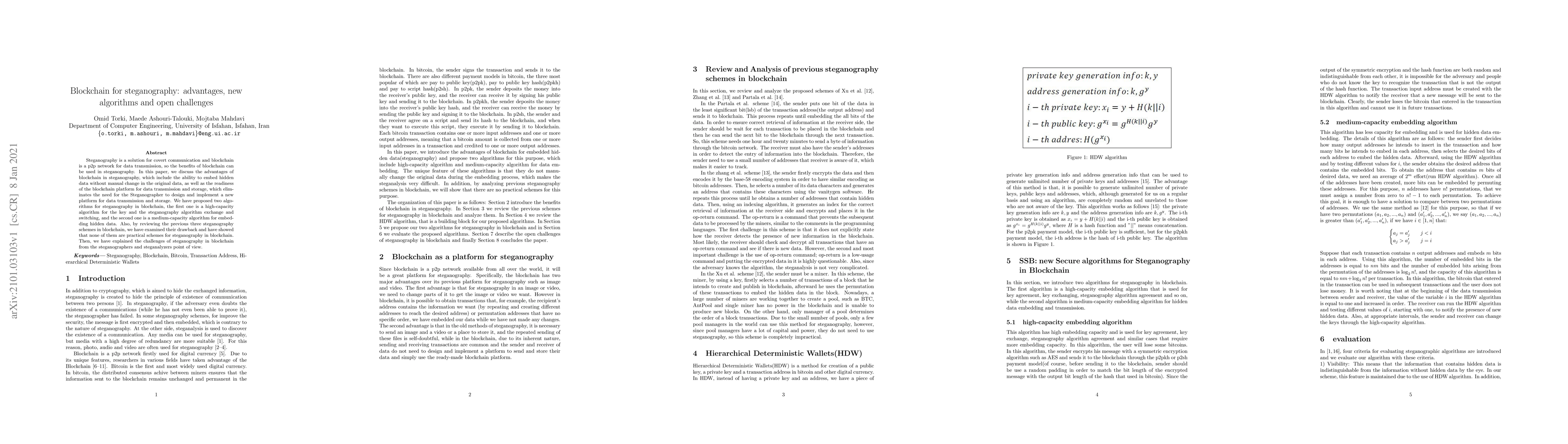 This paper explores the integration of blockchain technology into steganography, proposing two new algorithms for embedding hidden data. It highlights blockchain's advantages in eliminating the need for a new data transmission platform and discusses the practical challenges faced by both steganographers and steganalyzers.